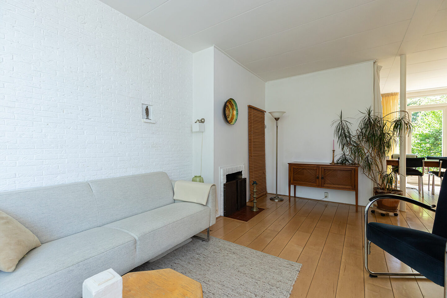 De woning zelf is ruim van opzet en heeft een praktische indeling. Via de hal met meterkast en toiletruimte kom je in de lichte Z-vormige woonkamer. Hier ligt een parketvloer en er is een sfeervolle open haard aanwezig. De openslaande deuren naar de achtertuin zorgen voor een fijne verbinding met buiten.