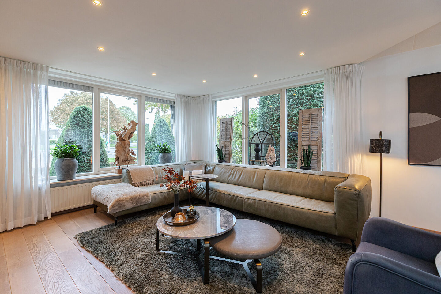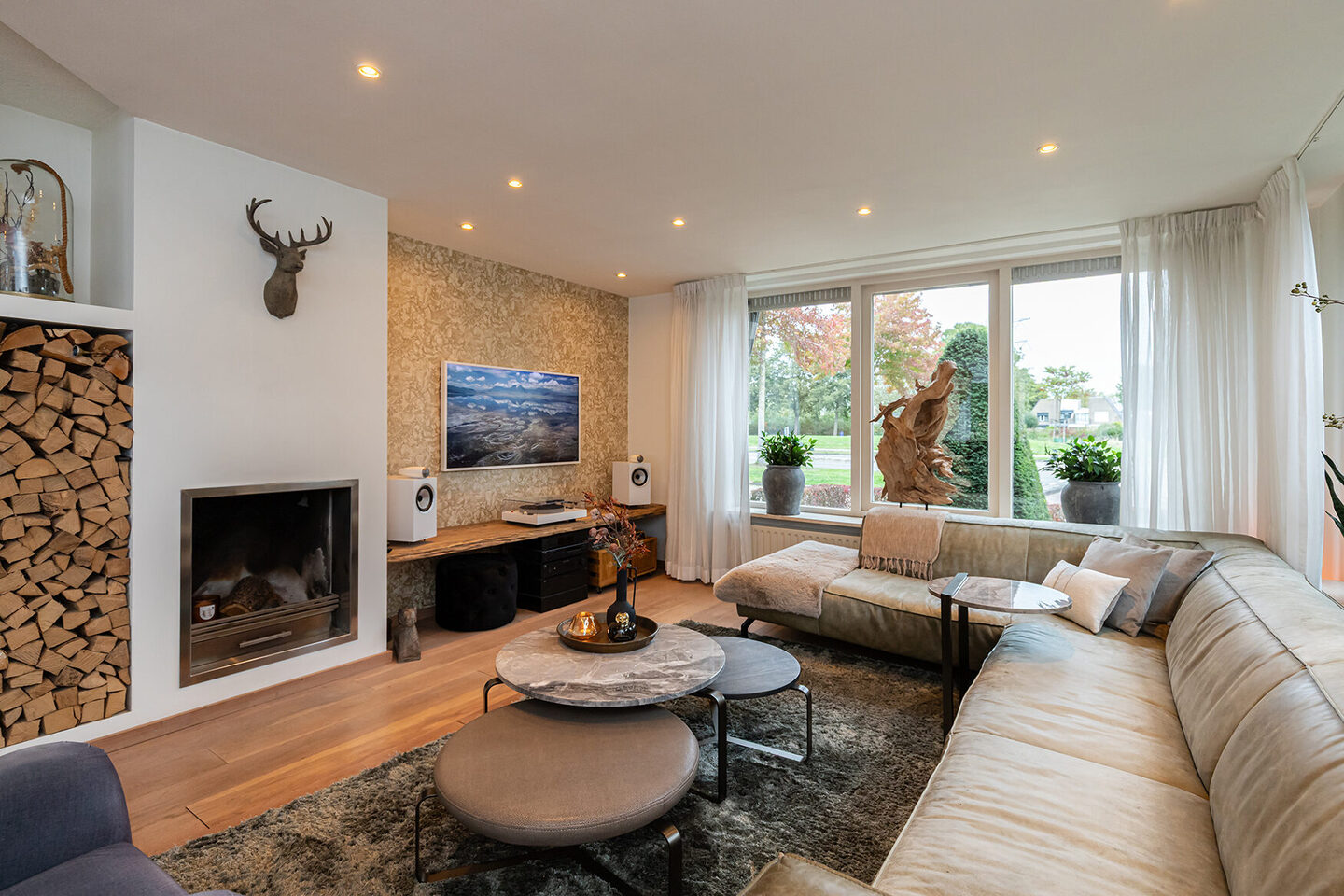 De woonkamer is royaal opgezet en heeft een sfeervolle open haard met houtopslag, grote ramen en een schuifpui naar de tuin. Hierdoor is er een prettige lichtinval en een mooi uitzicht op het groen. De parketvloer, convectorput en het deels verlaagde plafond met inbouwverlichting zorgen samen voor een warme, verzorgde uitstraling. Aan de voorzijde is er vrij uitzicht over het speelveld; aan de achterzijde grenst de schuifpui aan het terras en de zonnige tuin.