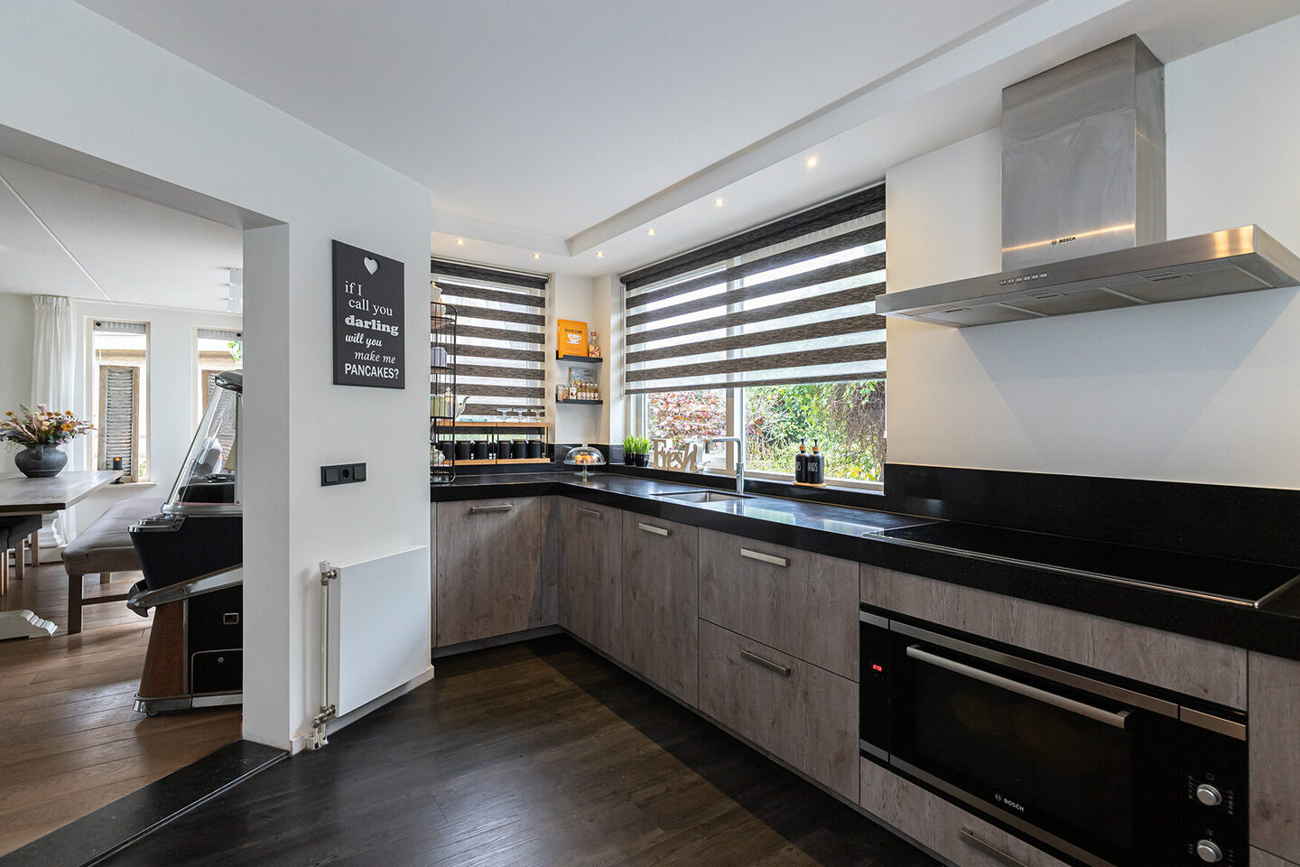 De halfopen keuken heeft een stoere, houtkleurige inrichting met een zwart composiet werkblad (2016). De keuken is slim ingedeeld met een apparatenwand en voorzien van moderne inbouwapparatuur: een inductiekookplaat, combimagnetron, oven, koelkast, vriezer, afzuigkap, quooker en een close-in boiler. De PVC-vloer en inbouwspotjes in het plafond versterken het moderne karakter, terwijl het uitzicht op de achtertuin het geheel compleet maakt.