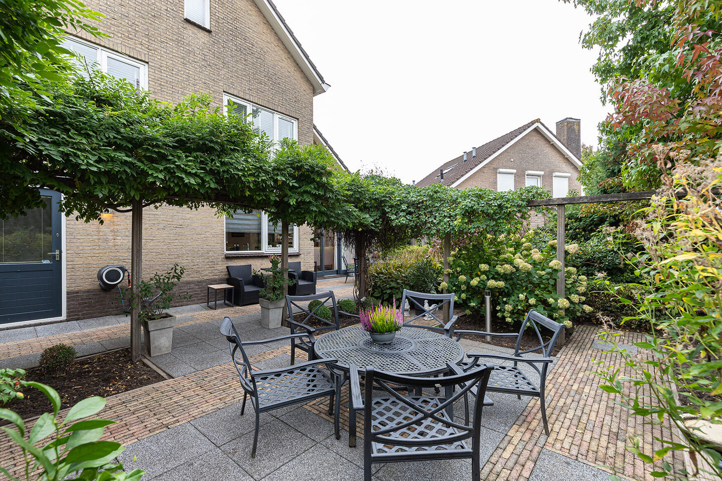 De tuin rondom de woning is smaakvol aangelegd met volwassen beplanting, gazon en een houten tuinhuis met terras. De achtertuin ligt op het westen en biedt veel privacy. Dankzij meerdere zitplekken is er altijd een plek in de zon of schaduw te vinden.
