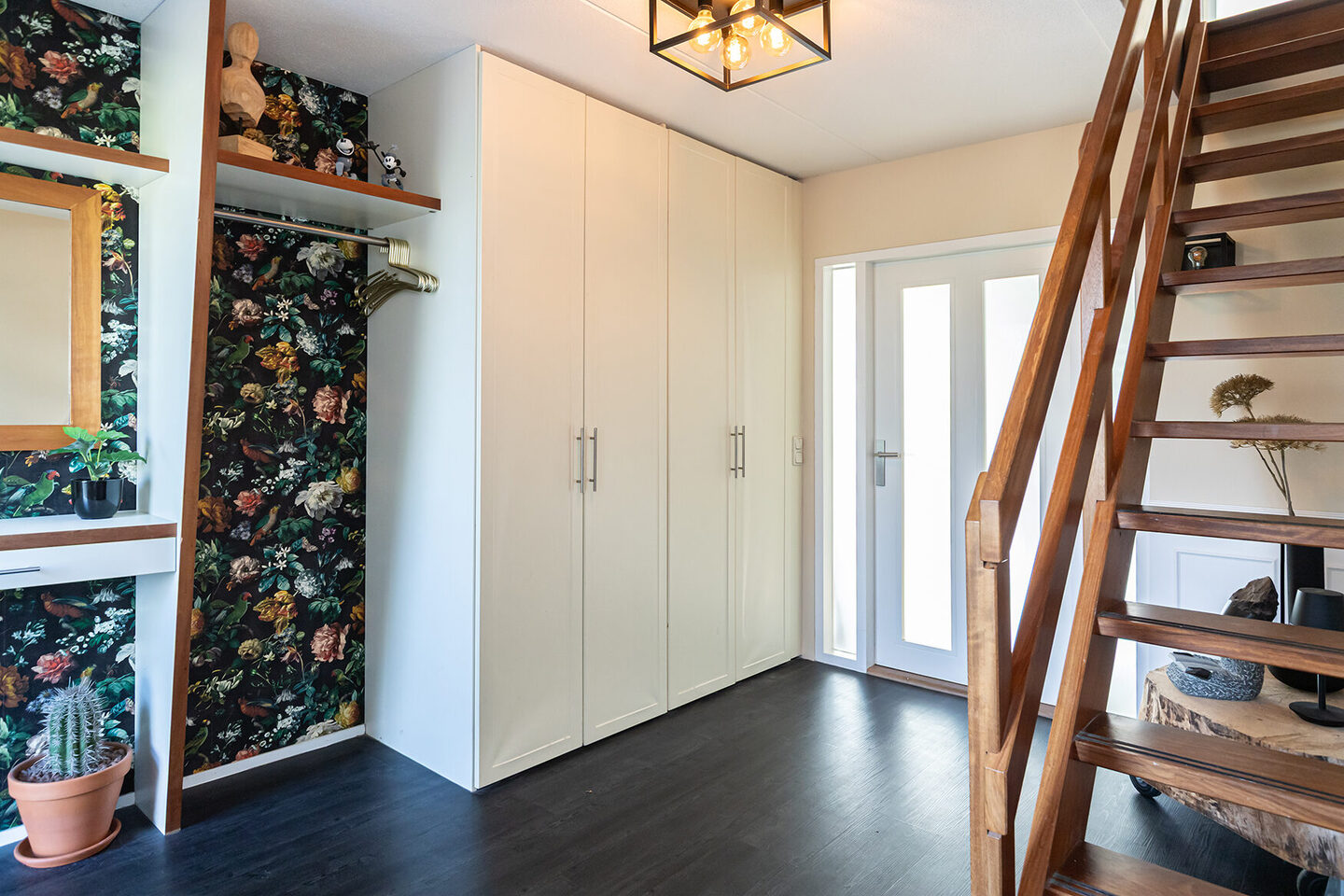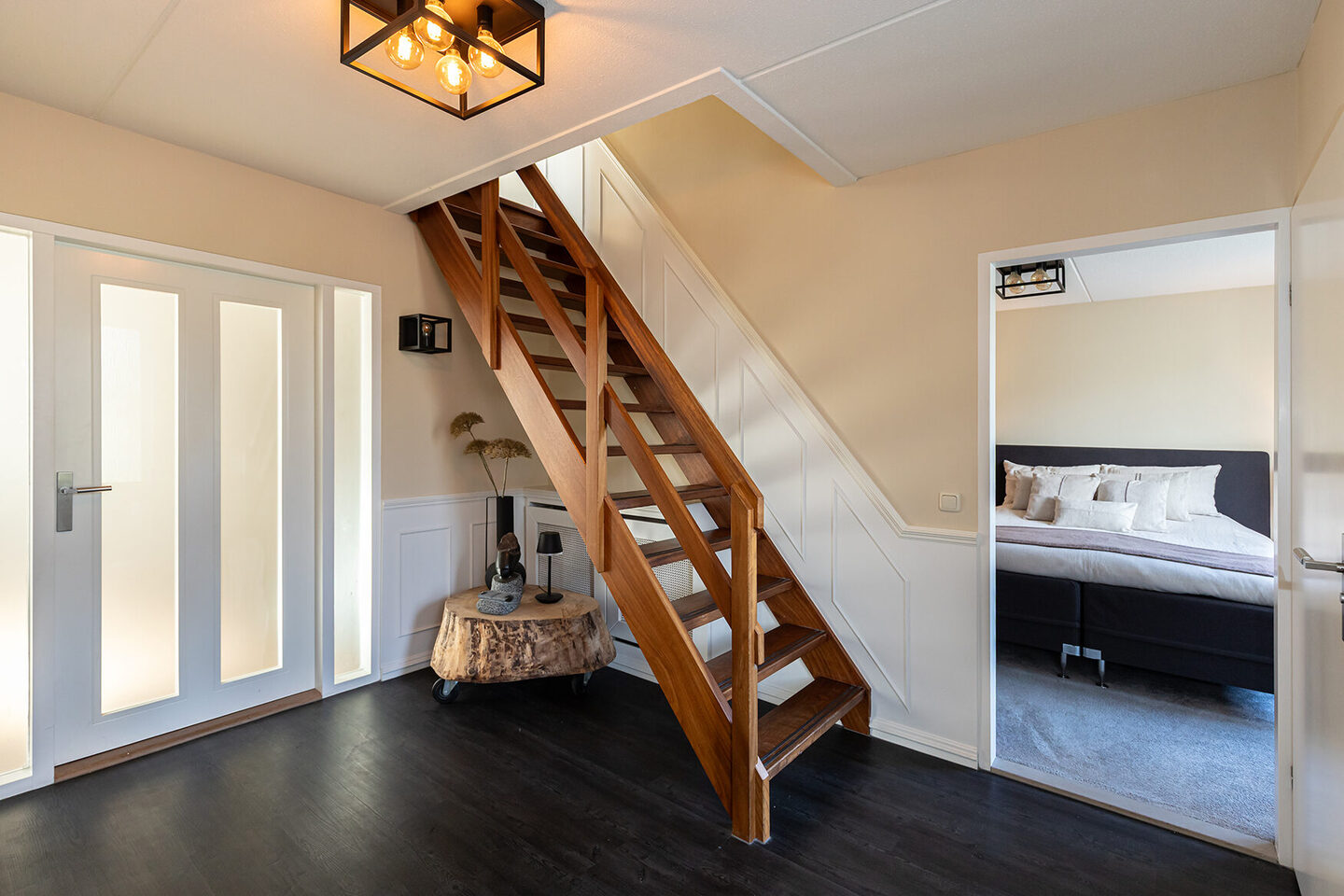 De ruime hal vormt een uitnodigende entree en biedt toegang tot de moderne toiletruimte, de woonkamer, de slaapkamer en de trap naar de verdieping. In de hal is een praktische garderobekast aanwezig.