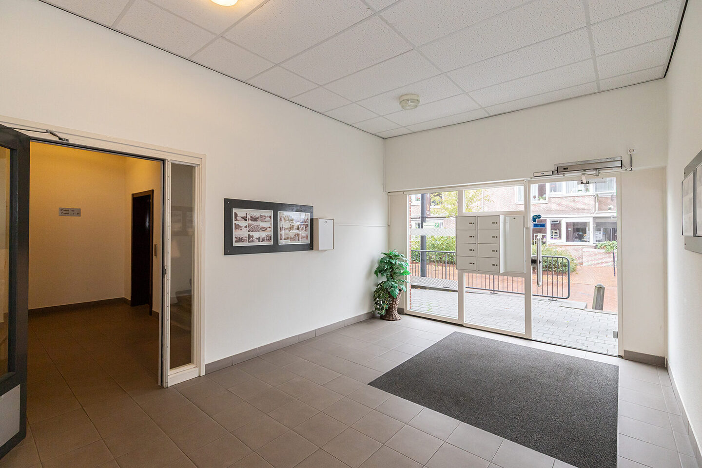 De centrale entree is netjes verzorgd en voorzien van een videofooninstallatie. Via het trappenhuis of de lift bereik je de eerste verdieping. De eigen berging bevindt zich direct naast de lift, handig voor het opbergen van fietsen en spullen.