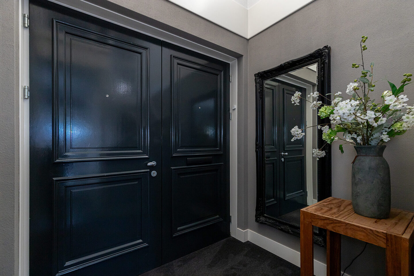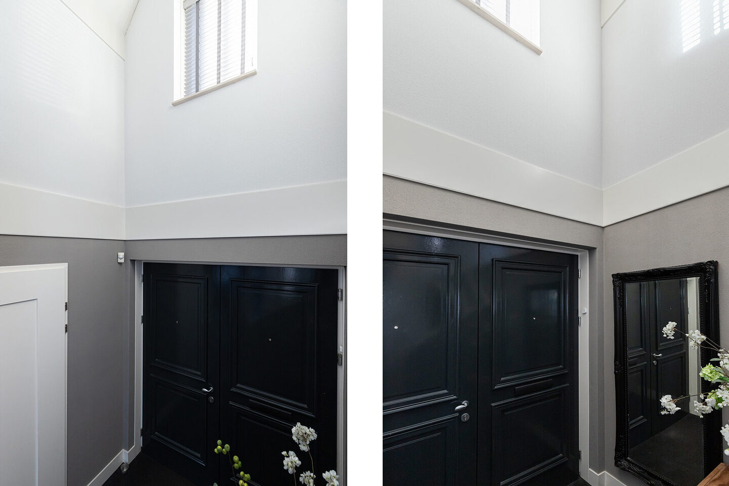 De entree leidt naar een statige hal met vide, die direct de ruimtelijkheid en het niveau van de woning laat zien. Vanuit hier is er toegang tot het modern afgewerkte toilet met wandtoilet en fonteintje, de meterkast en de verdieping via een elegante open trap. Glazen deuren openen naar de woonkamer.