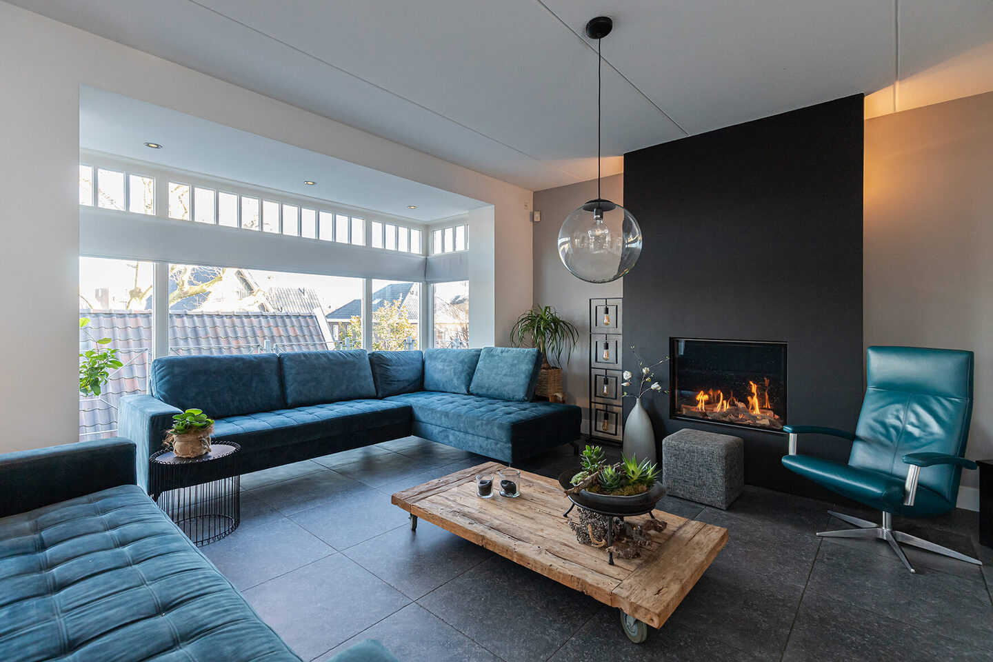 De woonverdieping is afgewerkt met een prachtige plavuizenvloer met vloerverwarming en ademt rust en luxe. De woonkamer is licht en sfeervol, mede dankzij de erker die zorgt voor een mooie lichtinval. De gashaard in moderne schouw vormt een warm middelpunt, ideaal voor lange avonden. Openslaande deuren verbinden binnen met buiten en geven toegang tot het balkon/terras én tot de tuin.