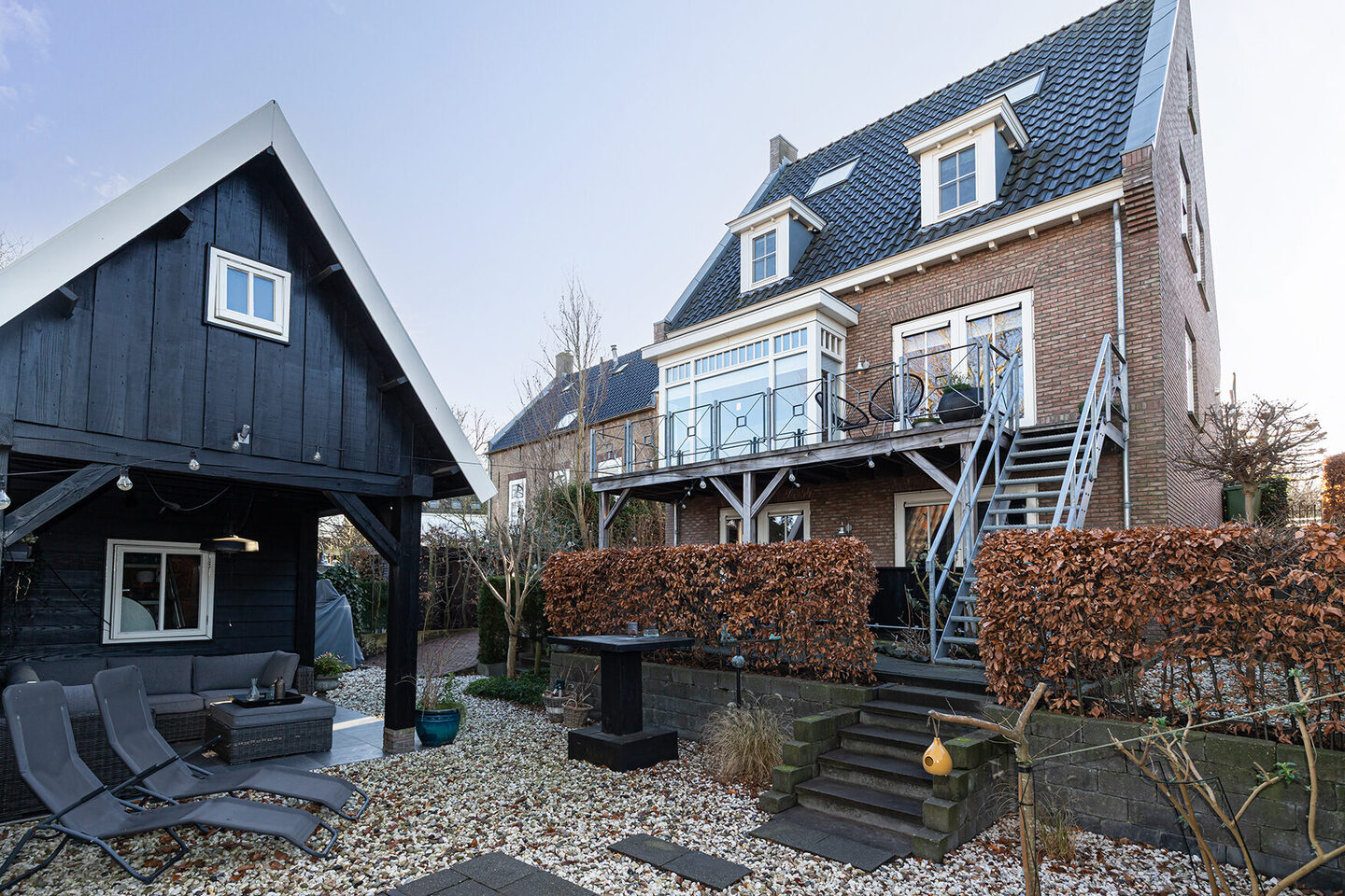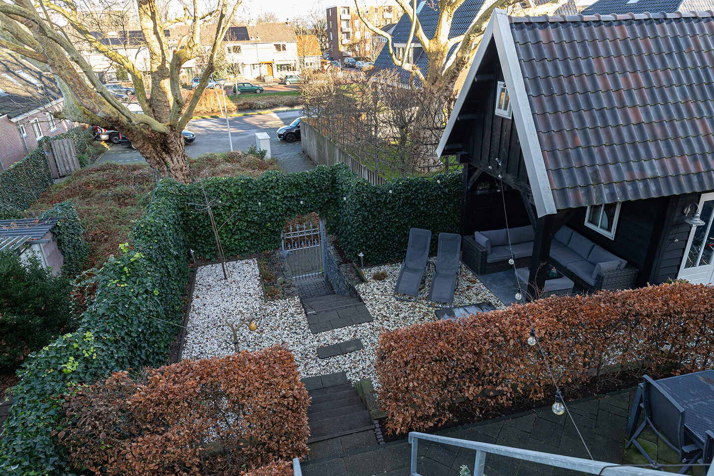 De achtertuin is gelegen op het noordoosten en met zorg aangelegd. Speelse niveauverschillen en meerdere terrassen zorgen voor afwisseling en gebruiksgemak. Stijlvolle hekwerken geven de tuin een verzorgd en veilig karakter. Daarnaast zijn er een buitenkraan voor en achter, buitenstopcontacten en sfeervolle buitenverlichting aanwezig.