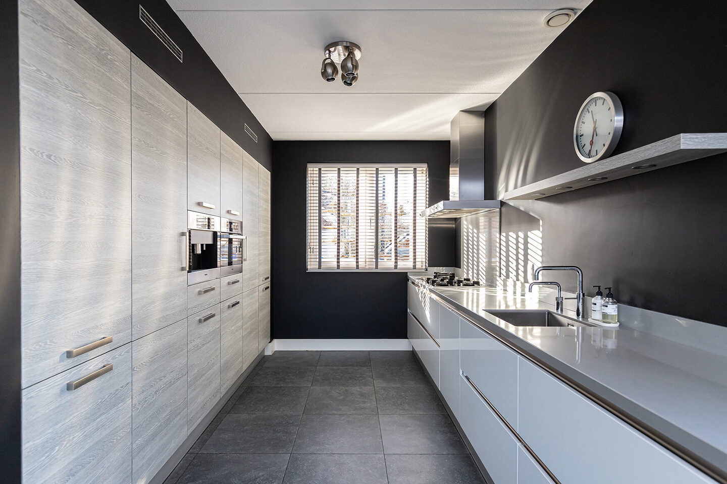 De open keuken is uitgevoerd in een praktische kombuisopstelling en combineert stijl met functionaliteit. Het werk- en kookgedeelte is uitgevoerd in wit hoogglans met een lichtgrijs composiet werkblad, terwijl de apparatenwand is afgewerkt in lichtgrijs met houtnerf. De keuken is voorzien van hoogwaardige inbouwapparatuur van Miele en Bosch, waaronder een 5-pits gaskookplaat met wokbrander, combimagnetron/oven, magnetron, vaatwasser, koelkast, nofrost vriezer, afzuigkap, Quooker en een Miele koffieapparaat.