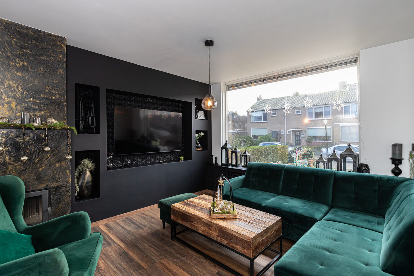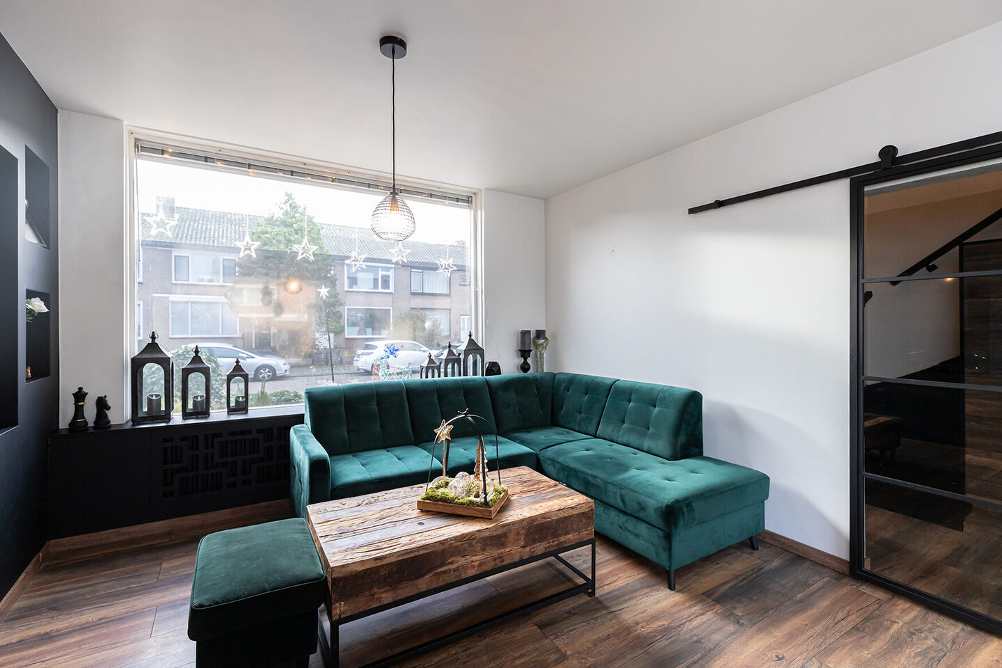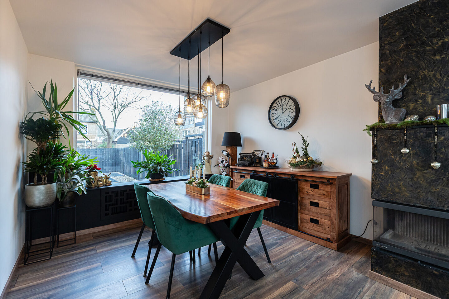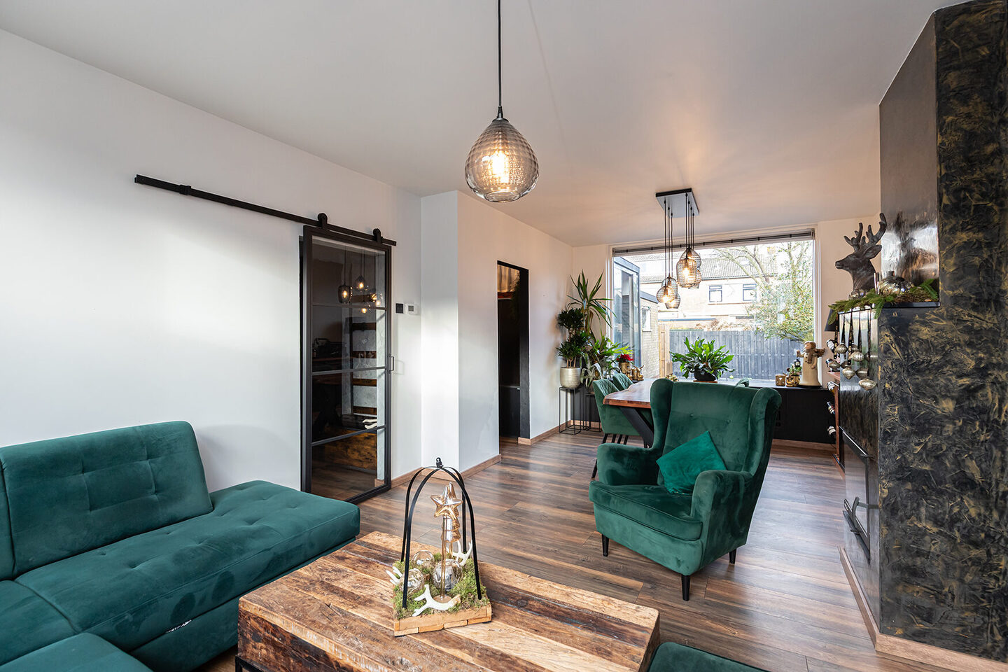 Via een glazen, zwartstalen schuifdeur is de doorzonwoonkamer bereikbaar, waar het daglicht rijkelijk naar binnen valt. De ruimte voelt open en uitnodigend aan en wordt versterkt door een sfeervolle schouw met houtkachel, ideaal voor gezellige avonden.