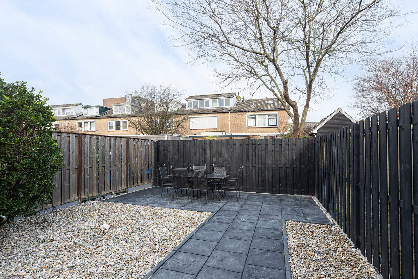 De achtertuin ligt op het noordoosten en is strak en onderhoudsvriendelijk aangelegd, met duidelijke zichtlijnen en een royaal terras. Door de diepte van de tuin is er altijd wel een plek in de zon of juist in de schaduw te vinden. In de tuin staat een stenen berging met elektra.
