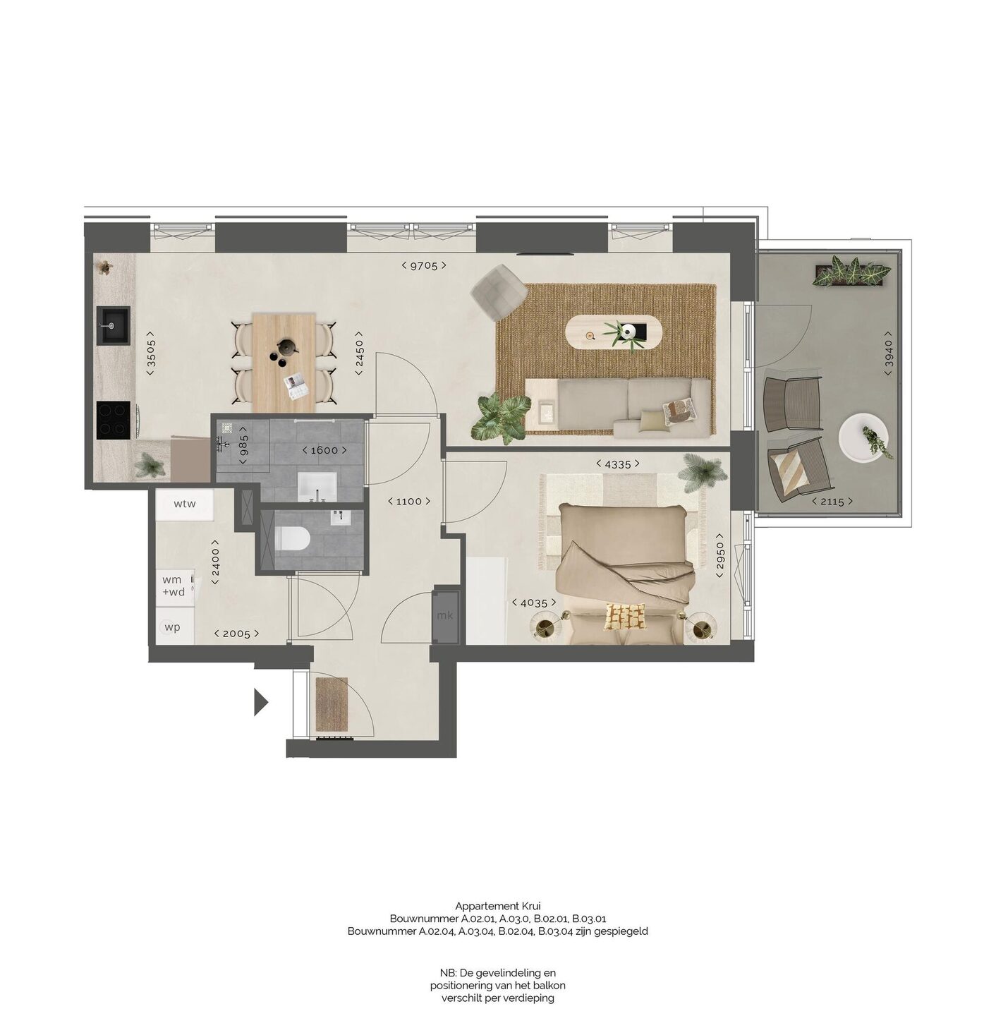 De 2-kamerappartementen beschikken in de woonkamer en keuken over veel ramen door de ligging aan de gevel. Het balkon grens aan de woonkamer en is, zeker voor een 2-kamerappartement, fraai van maatvoering.