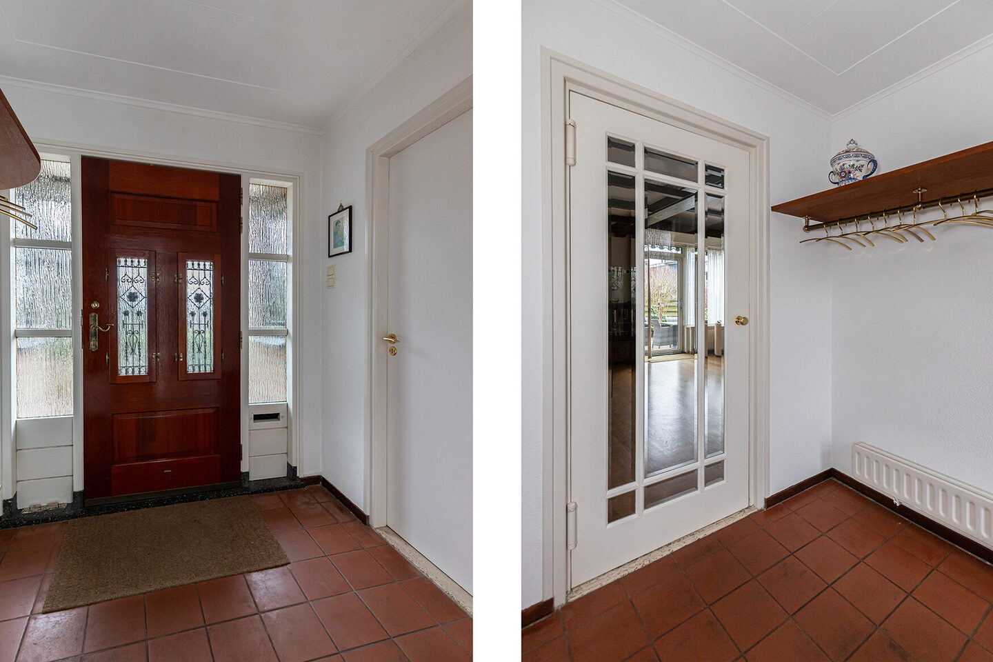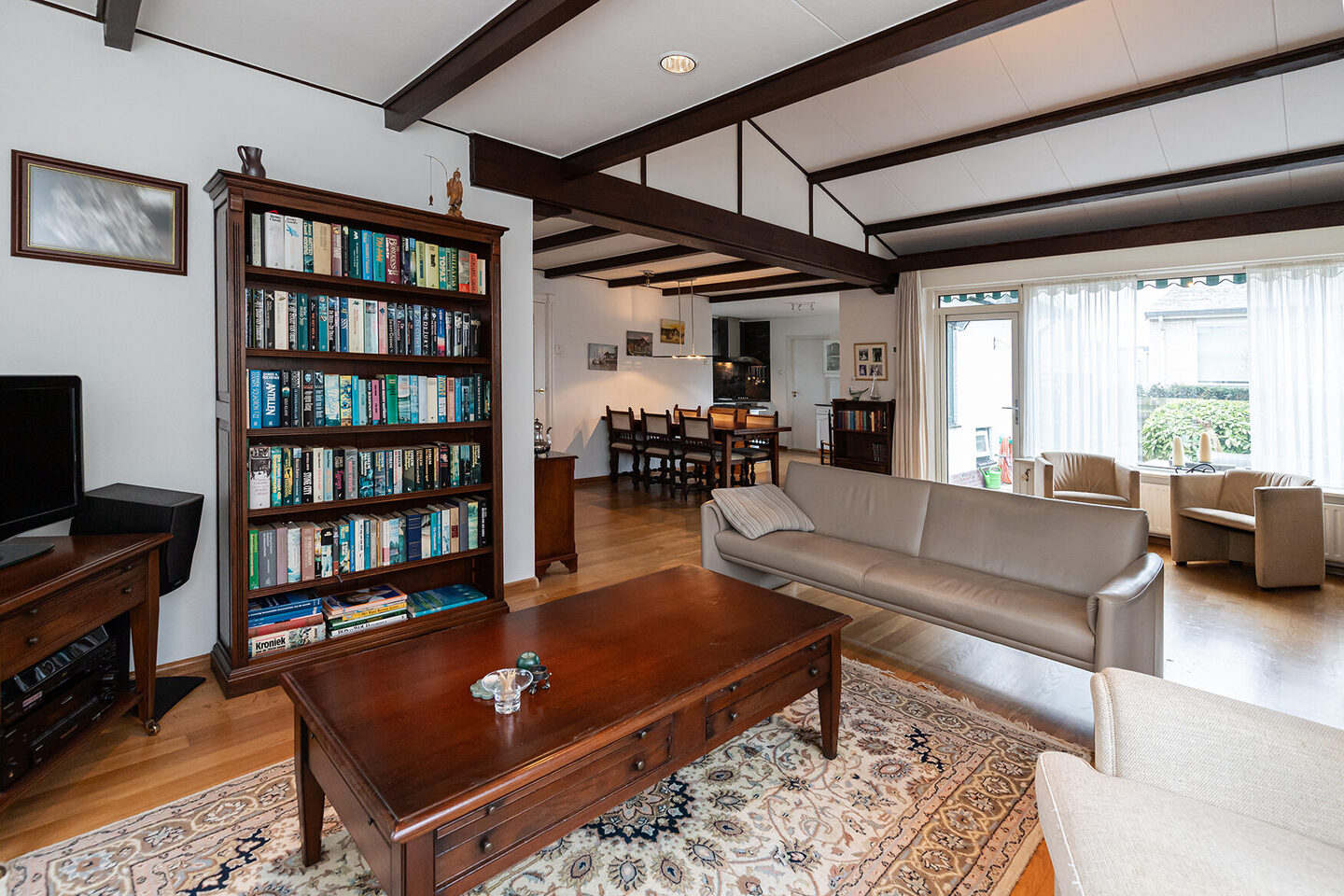 Via de stijlvolle voordeur betreedt u de woning in een karakteristieke vestibule met originele tegelvloer. Deze eerste indruk zet direct de toon. Vanuit hier leidt een deur naar de indrukwekkend ruime, L-vormige woonkamer. De verschillende plafondhoogtes met balken, de marmeren schouw met gashaard en de fraaie parketvloer zorgen voor een warme en sfeervolle uitstraling. Dankzij de vele raampartijen geniet u hier van een prettige lichtinval en via een deur is er direct toegang tot de tuin.