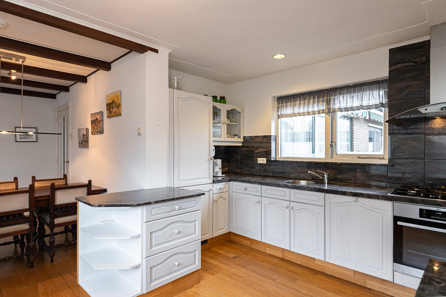 Aansluitend bevindt zich de halfopen keuken, uitgevoerd met witte keukenkastjes en granieten werkbladen. De keuken biedt volop bergruimte en is voorzien van diverse inbouwapparatuur, waaronder een gaskookplaat, afzuigkap, oven, vaatwasser en koel-vriescombinatie. Vanuit de keuken is er toegang tot zowel de kelderkast als de praktische bijkeuken. In de bijkeuken bevinden zich de wasmachineaansluiting en een deur naar de zonnige patiotuin. Daarnaast is vanuit hier de inpandige berging bereikbaar met de opstelplaats van de cv-installatie.