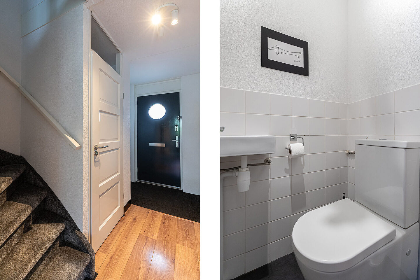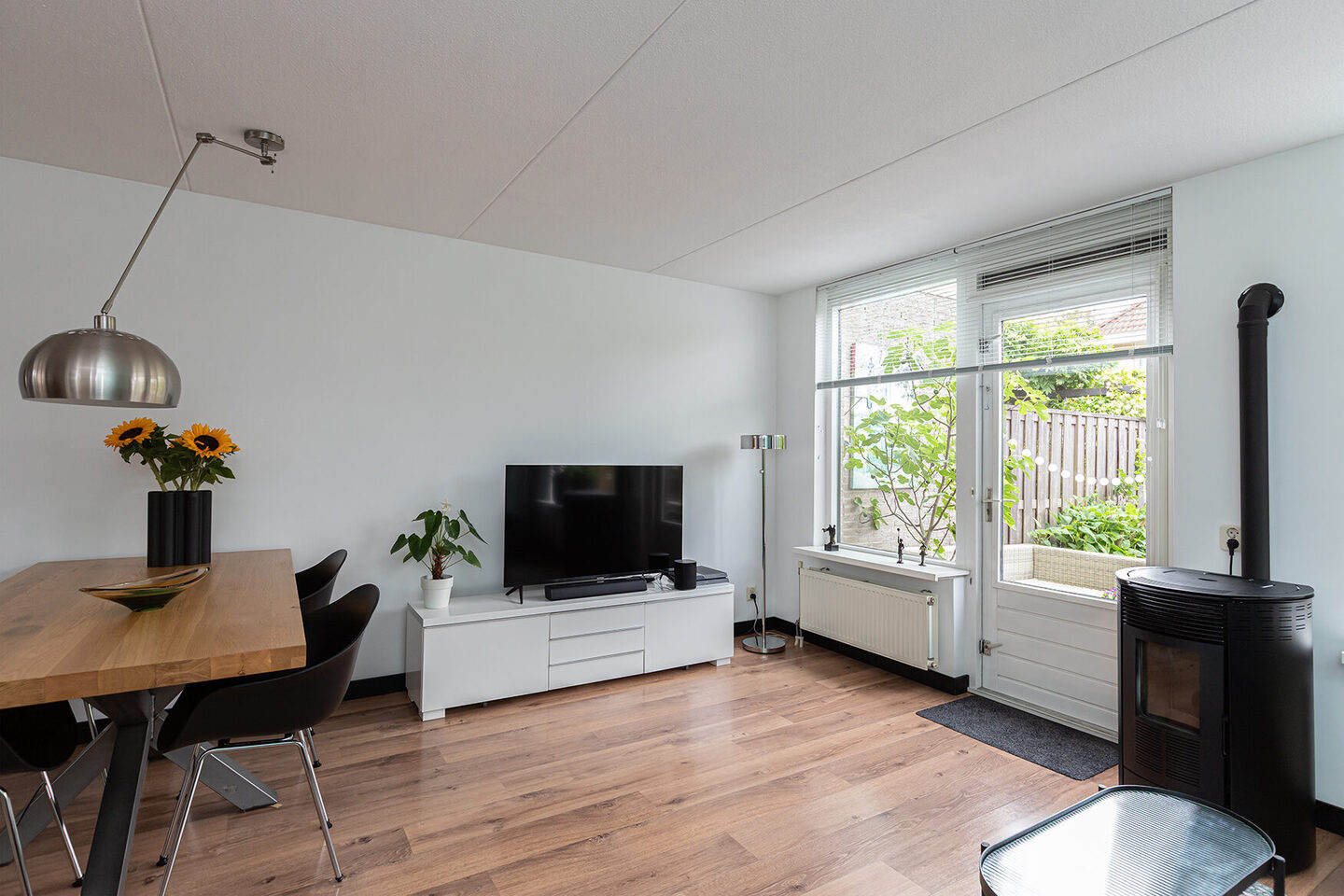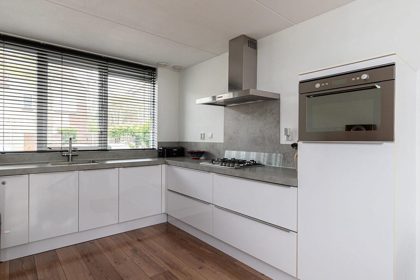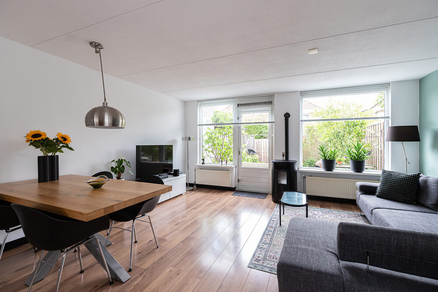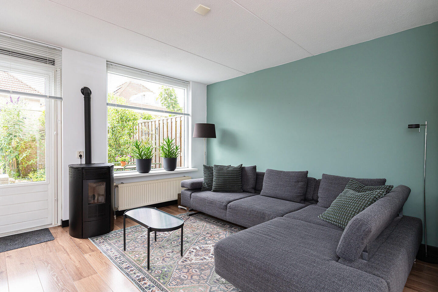 Bij binnenkomst tref je een nette, representatieve hal met toegang tot de meterkast, het toilet en de trap naar de verdieping. De ruime en lichte woonkamer voelt direct prettig aan, met als sfeervol middelpunt een stijlvolle pelletkachel. Aan de voorzijde van de woning bevindt zich de open keuken, uitgevoerd in een strakke, moderne stijl met witte fronten (Keukenkampioen) en een grijs kunststof werkblad. De keuken is van alle gemakken voorzien, waaronder een vaatwasser, combimagnetron, kookplaat, koelkast, afzuigkap, Quooker en een close-in boiler. Vanuit de keuken loop je zo de zonnige achtertuin in.