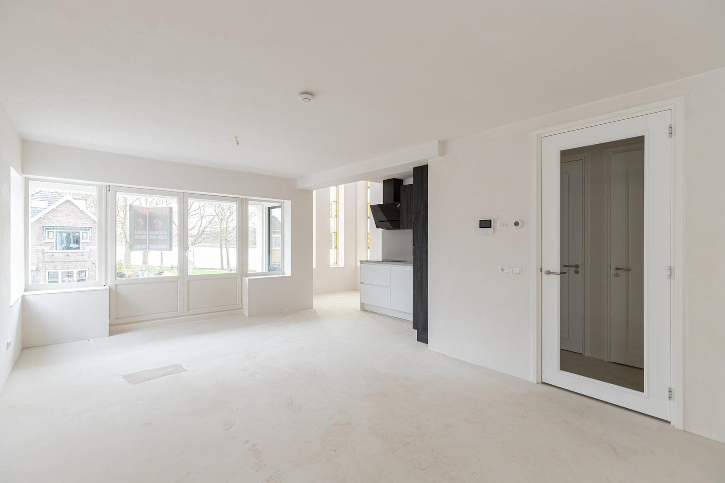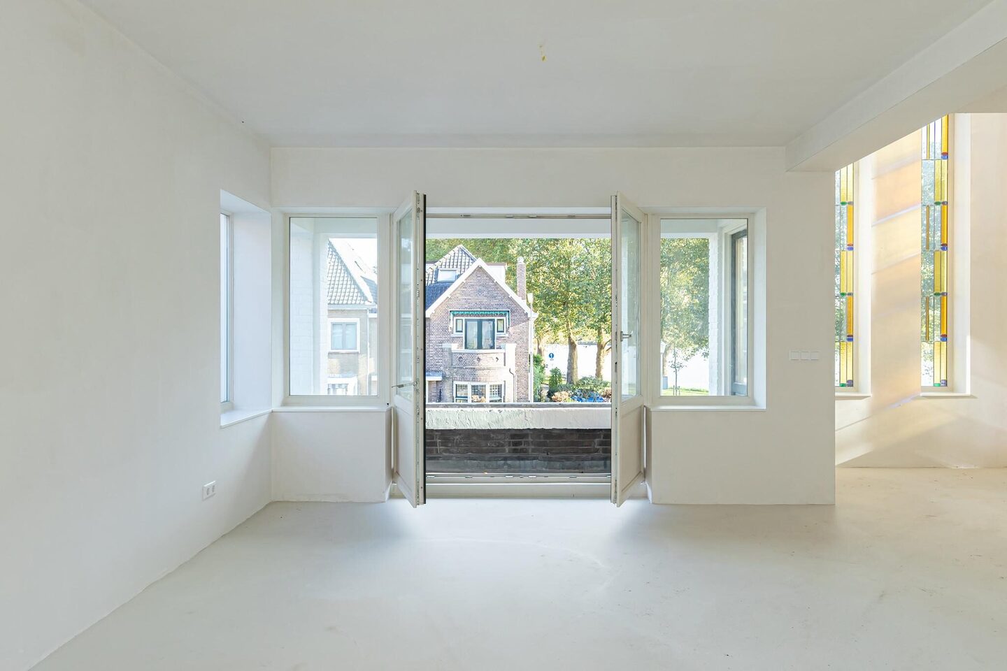 Vanuit de hal kom je in de ruime en lichte woonkamer met open keuken. Middels de openslaande deuren is het balkon bereikbaar. Leuk detail zijn de authentieke glas-in-lood ramen.