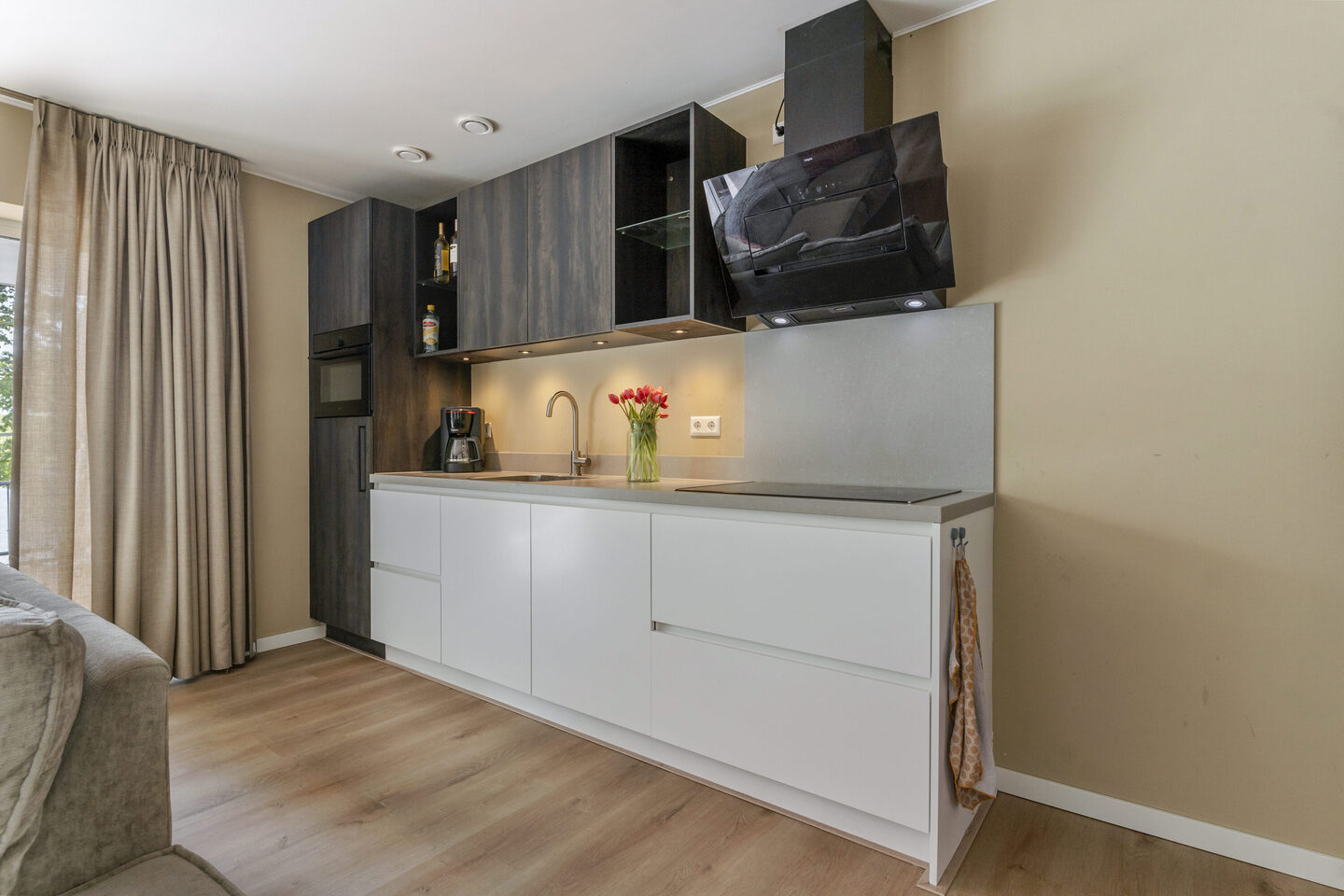 De moderne, open keuken is voorzien van een inductiekookplaat, afzuiginstallatie, koel-vriescombinatie, combi-magnetron en een vaatwasser.