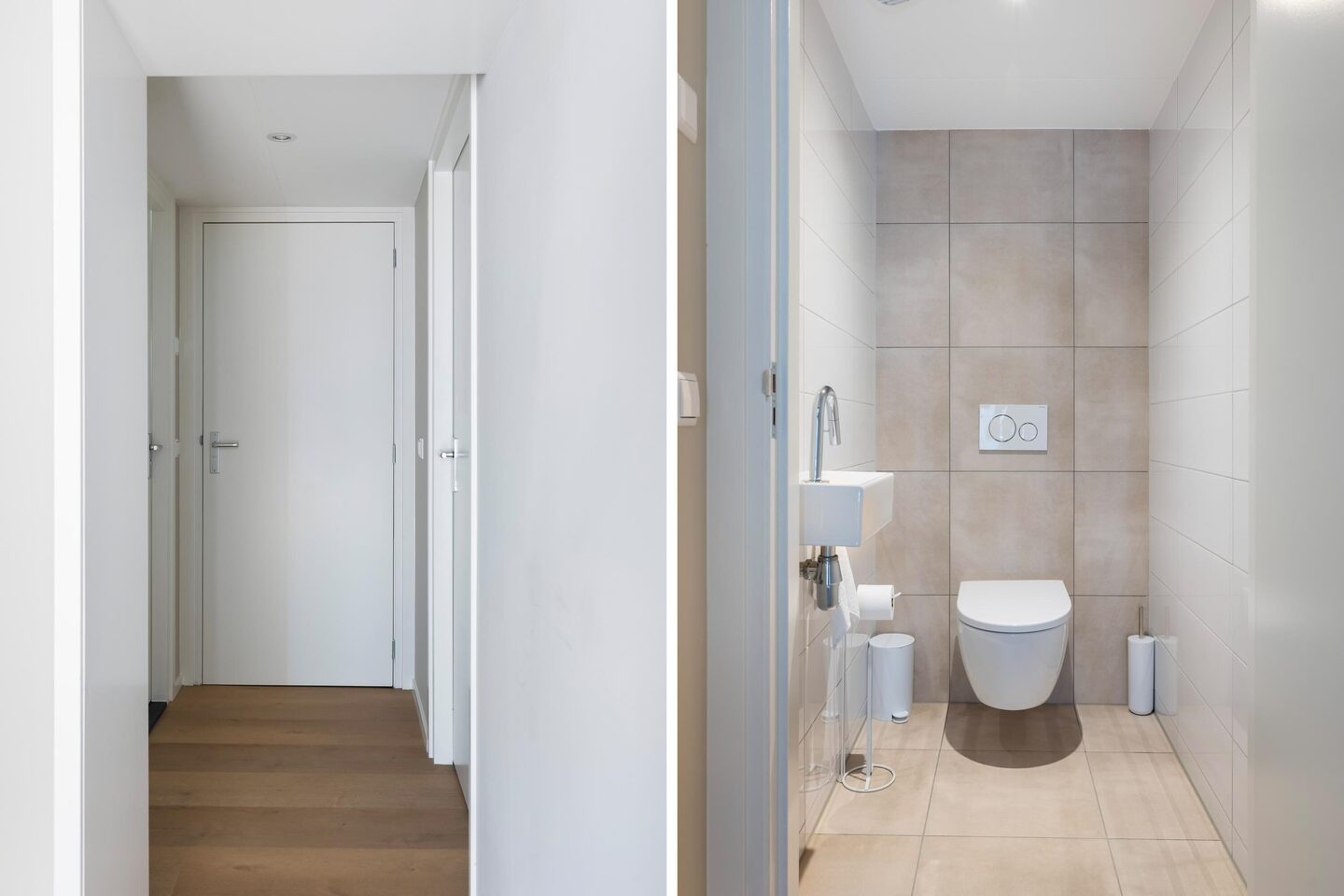 Deze volledig betegelde badkamer beschikt over een inloopdouche, wastafel inclusief meubel, designradiator en een wasmachine-droger combinatie. Het separate toilet ligt direct naast de badkamer.