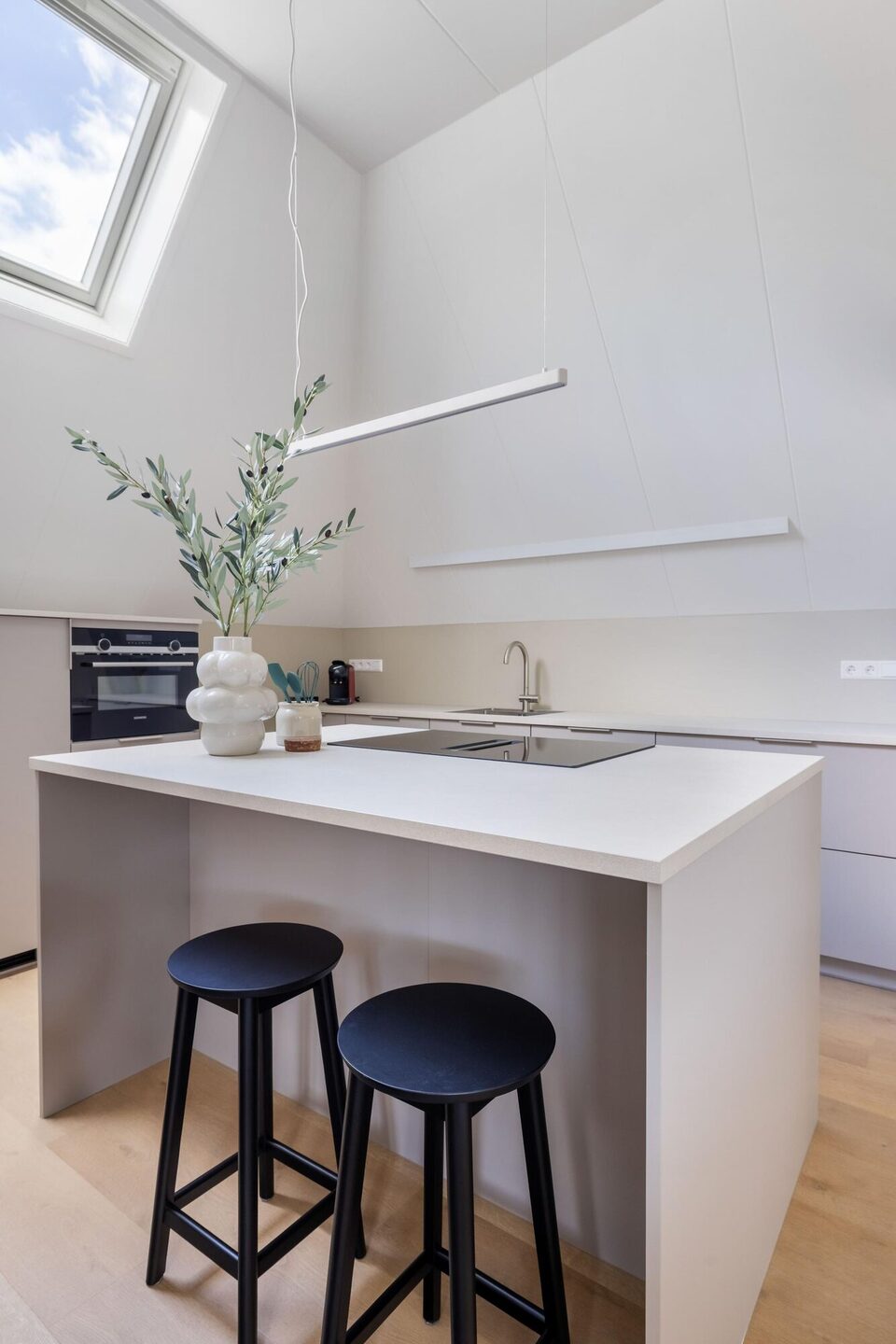 Speelse en lichte woon- en eetkamer met open keuken, gelegen aan de voorzijde van de woning. De woonkamer, met een nokhoogte van 3,09 meter en grote raampartijen, is voorzien van een neutrale laminaatvloer en een gezellige zithoek met tv. Centraal in deze ruimte bevindt zich de moderne keuken met kookeiland, in rechte opstelling en uitgerust met een koel-vriescombinatie, vaatwasser, inductiekookplaat met geïntegreerde afzuiging, combi-oven en volop kastruimte. Daarnaast is er een praktisch barretje waar je gezellig kunt zitten.