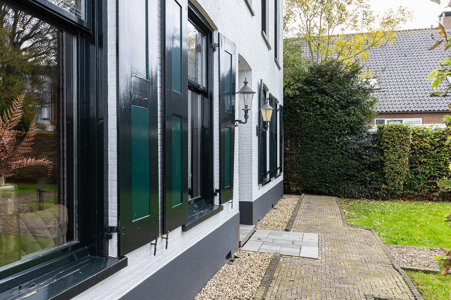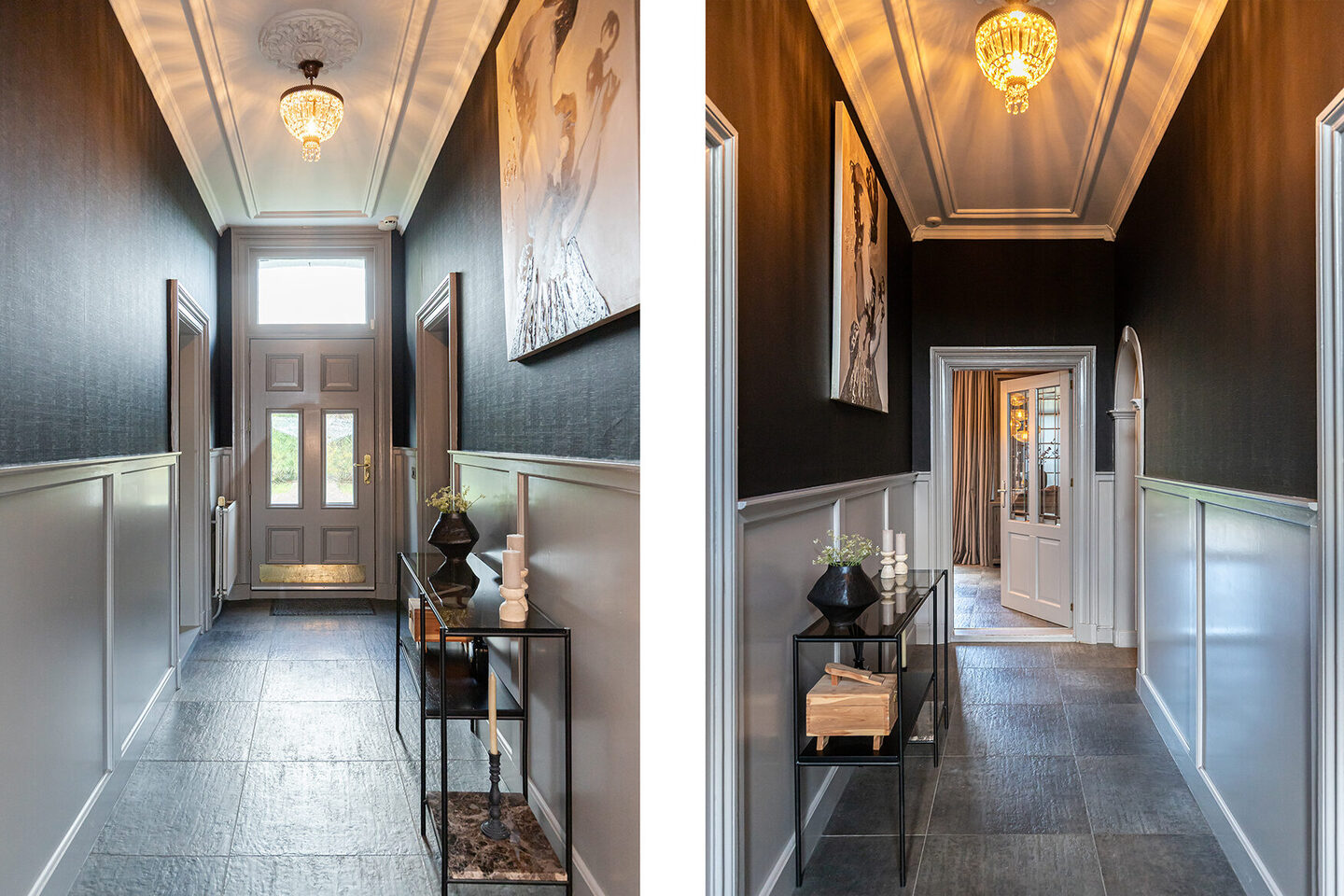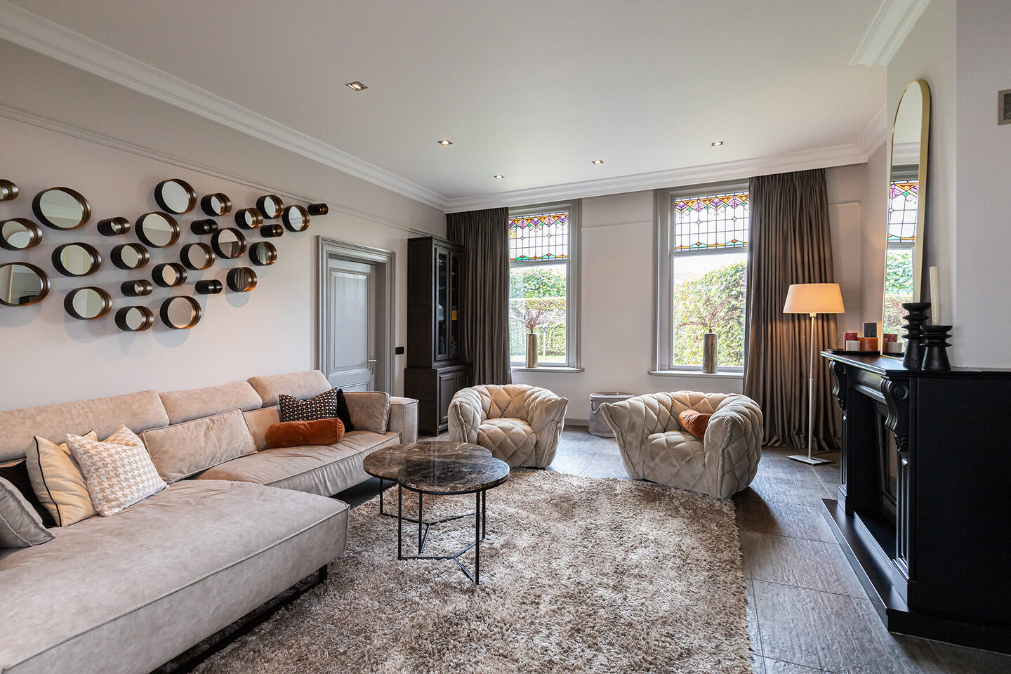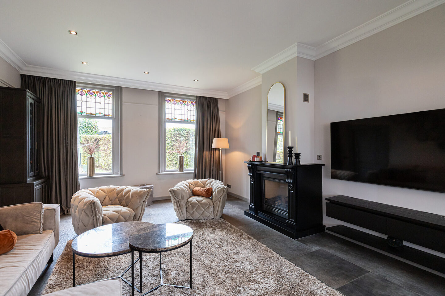 De entree straalt direct de sfeer uit die de rest van de woning kenmerkt. De hoge plafonds, de lambrisering, het stijlvolle behang en de natuurstenen vloer vormen een harmonieus geheel. De woonkamer heeft een warme en uitnodigende uitstraling. De natuurstenen schouw met gashaard vormt het hart van de ruimte. Het glas-in-lood in de bovenramen herinnert subtiel aan het oorspronkelijke karakter van het huis.