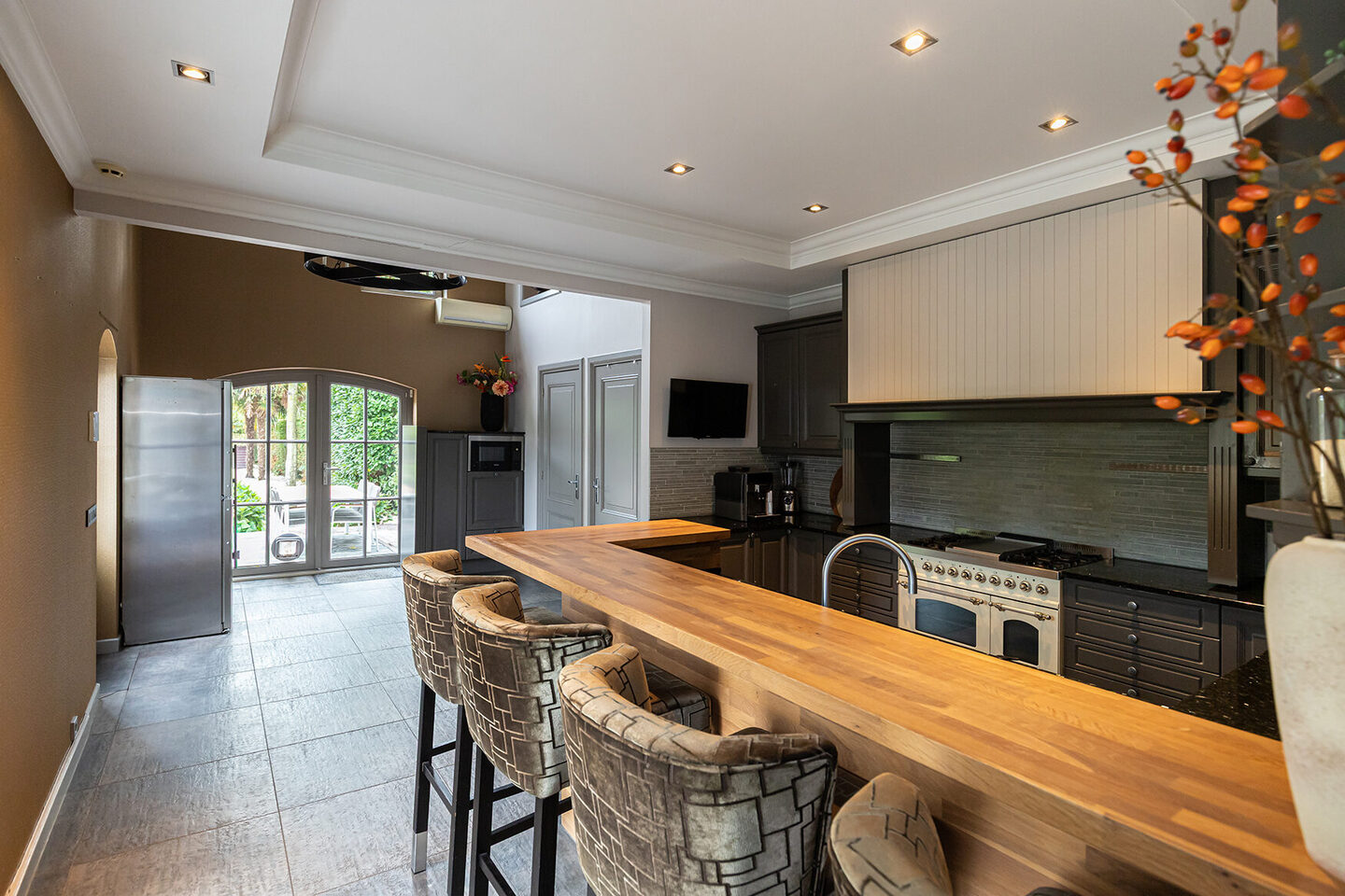 De woonkeuken is royaal van formaat en ingericht in landelijke stijl, voorzien van een klassiek Boretti fornuis en diverse inbouwapparatuur. De houten eetbar creëert een informele plek voor een snel ontbijt of een gezellige borrel tijdens het koken. Openslaande deuren verbinden de keuken met het terras. Ook hier zijn de natuurstenen tegels en plafondafwerking doorgezet, waardoor het geheel rust en luxe uitstraalt.