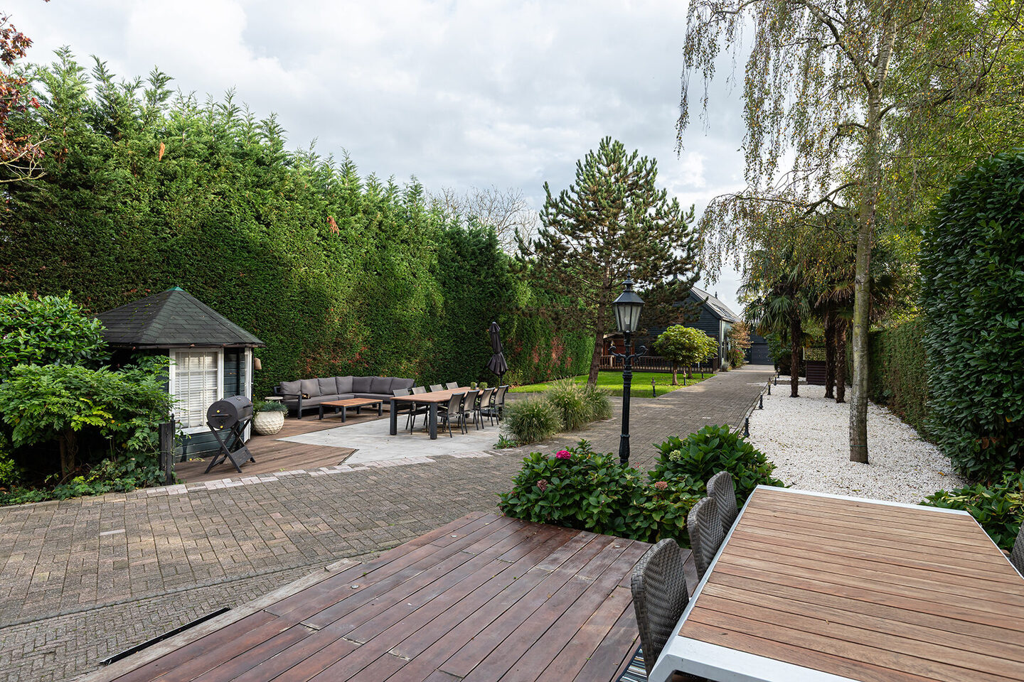Direct achter de woning ligt een ruim terras dat bereikbaar is vanuit zowel de eetkamer als de keuken. Vanaf hier is er prachtig zicht op het voorste deel van de tuin, met een tweede terras, speelgras en kleurrijke borders. De tuin is volwassen en
