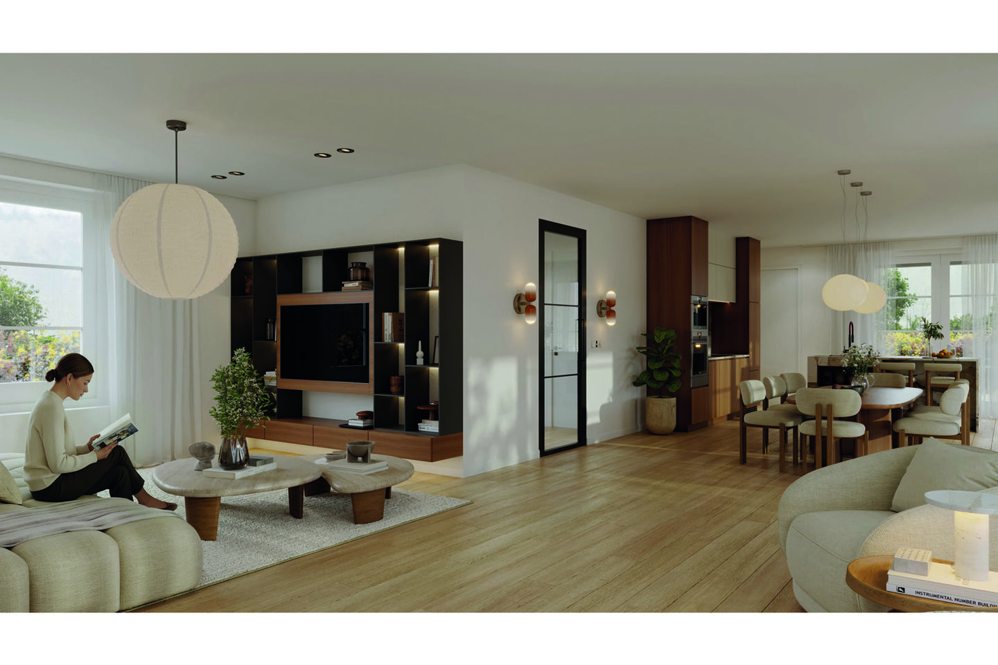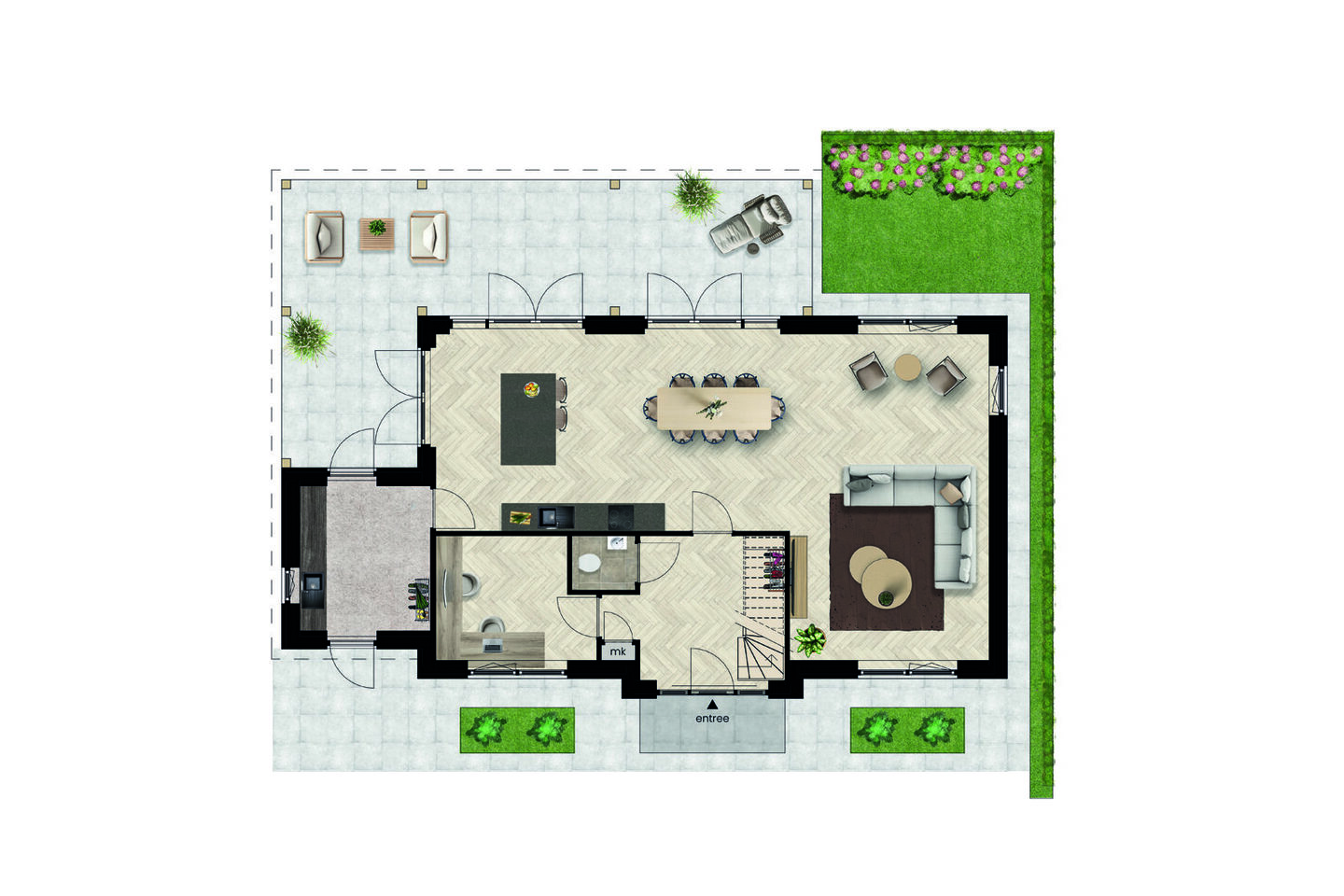 Vanuit hier is er toegang tot een aparte werkkamer, ideaal als kantoor of study, en tot de royale woonkamer. Deze leefruimte is een uitnodiging op zich: drie dubbele openslaande deuren verbinden binnen met buiten en brengen de tuin letterlijk tot leven in de woonkamer. Aan de voorzijde is ruimte voor een open keuken, die naadloos opgaat in het geheel en het hart van het huis vormt. In de aangrenzende bijkeuken is plaats voor een extra keukenblok en vind je tevens toegang tot de tuin — praktisch en comfortabel voor het dagelijks gebruik.