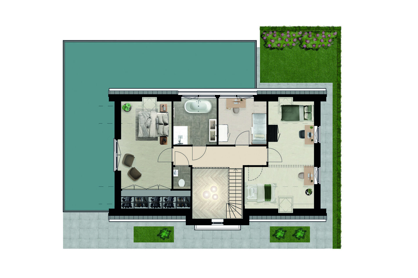 Op de verdieping bevinden zich vier slaapkamers, elk met een eigen karakter en volop lichtinval. De vide biedt zicht op de entree en versterkt het ruimtelijke gevoel dat deze woning zo bijzonder maakt. De badkamer, voorzien van een dakkapel, is voorbereid op jouw persoonlijke invulling. Daarnaast is er een separate toiletruimte, wat het wooncomfort verhoogt.