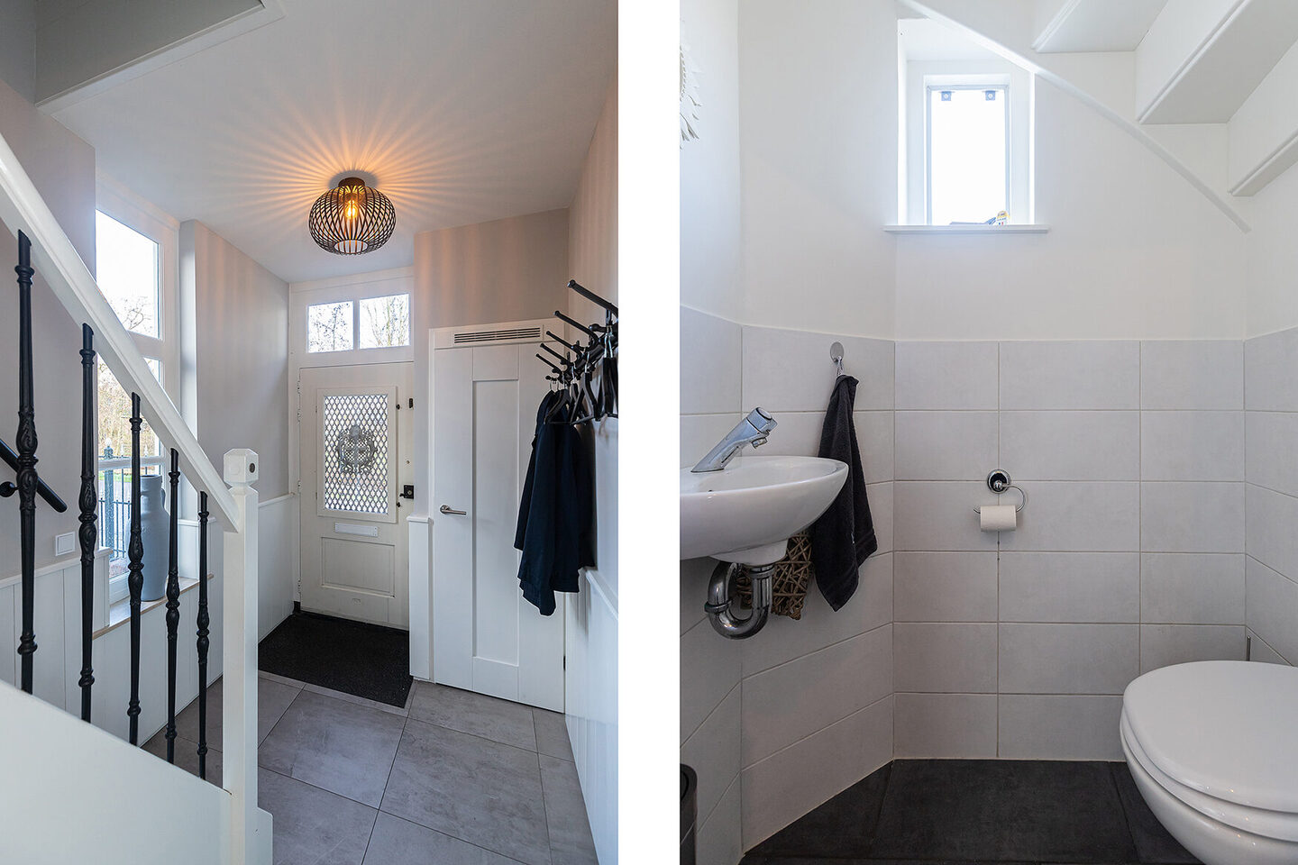 De gehele begane grond is afgewerkt met grote, lichtgrijze plavuizen voorzien van comfortabele vloerverwarming. De strak gestuukte wanden en plafonds, in combinatie met sfeervolle sierlijsten, zorgen voor een stijlvolle afwerking. Halverwege de woning bevindt zich de bijkeuken met aansluitingen voor wasapparatuur, extra opbergruimte en een handige zijdeur naar de tuin.