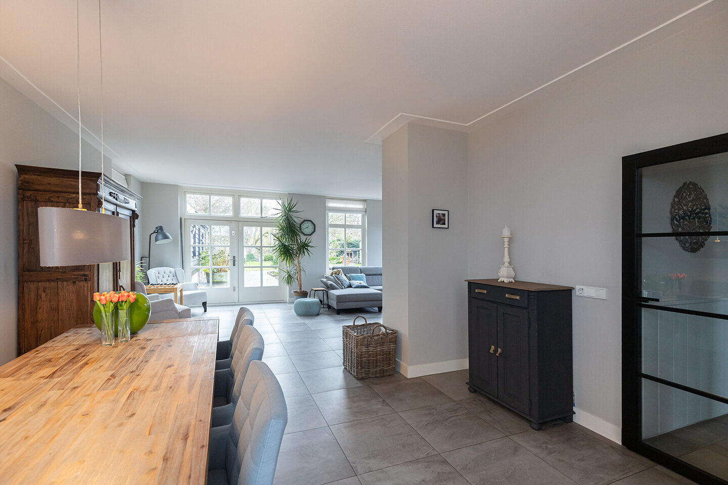 Bij binnenkomst treft u een royale entree die toegang biedt tot de ruime living, het moderne toilet, de praktische bijkeuken en de trap naar de eerste verdieping. Via een moderne stalen deur bereikt u de riante woonkamer aan de achterzijde van de woning. Hier stroomt daglicht rijkelijk binnen door de grote ramen en openslaande deuren naar de tuin. De recent geplaatste inzethaard voegt extra warmte en sfeer toe aan deze prachtige ruimte.