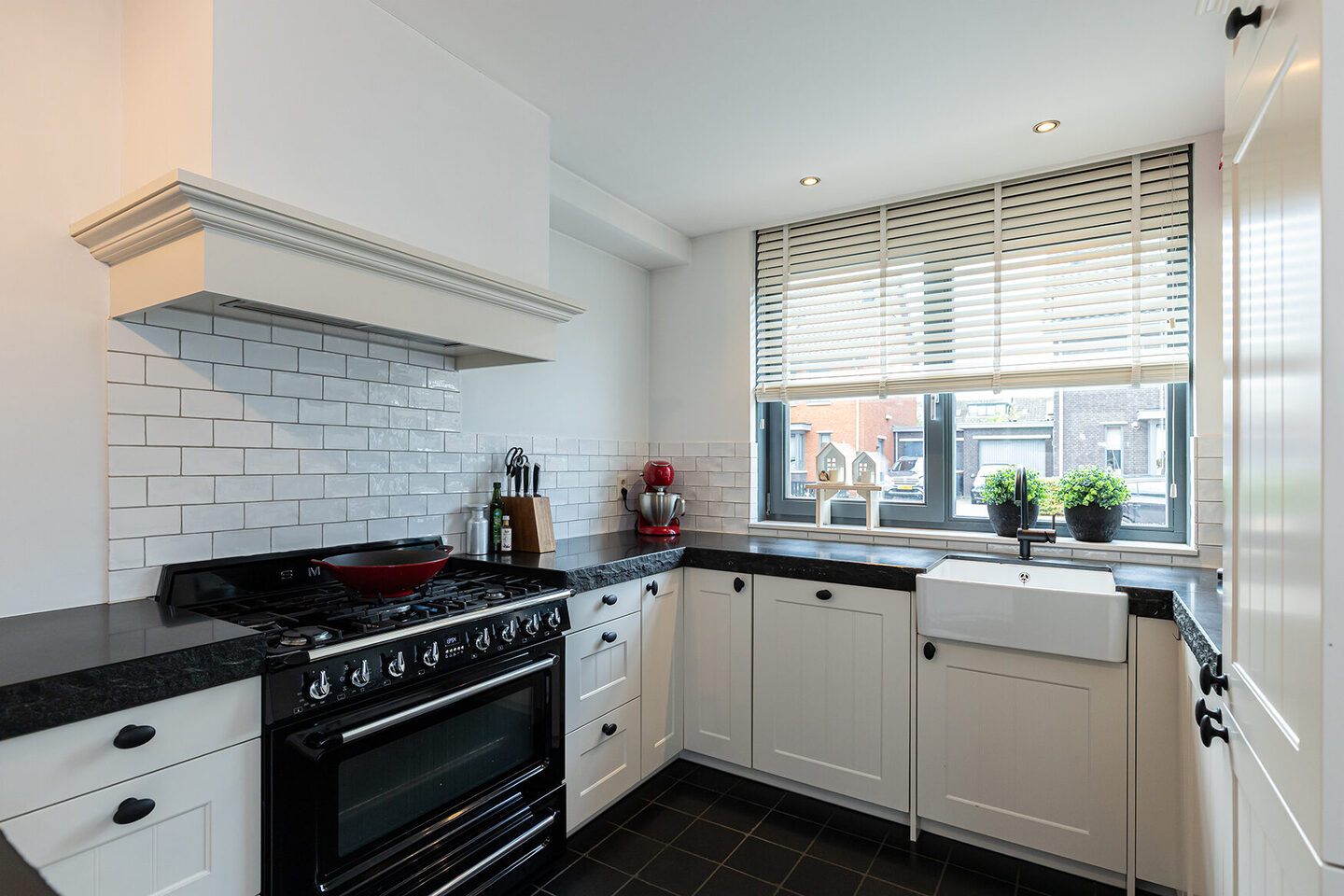 De hal biedt toegang tot de meterkast, de moderne toiletruimte en de trapopgang naar de verdieping. De woonkamer is een sfeervolle leefruimte met een fraaie aanbouw aan de achterzijde en een openslaande deur naar de tuin. De natuurstenen vloer met vloerverwarming zorgt voor een aangename temperatuur en een luxe uitstraling. De open keuken aan de voorzijde is praktisch ingedeeld en afgewerkt in een tijdloze combinatie van witte kastjes en een antracietkleurig natuurstenen werkblad. Dankzij het extra werkblad met eetgedeelte is er volop ruimte om samen te koken, te borrelen of even aan te schuiven voor een snelle maaltijd. De keuken is uitgerust met hoogwaardige apparatuur, waaronder een nostalgisch 6-pits SMEG fornuis, oven, magnetron, vaatwasser, koelkast, vriezer en afzuigkap.