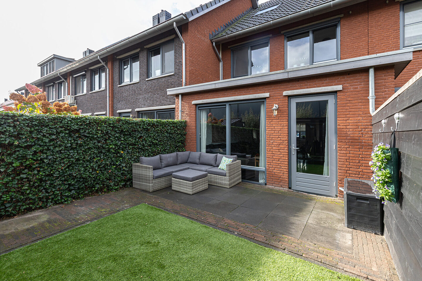 De tuin is met evenveel aandacht aangelegd als het interieur. De voortuin is onderhoudsvriendelijk en bestraat, terwijl de achtertuin een sfeervolle mix biedt van een royaal terras, kunstgazon en voldoende ruimte voor een trampoline of loungeset. De houten schutting zorgt voor privacy en achterin de tuin staat een houten berging met elektra.