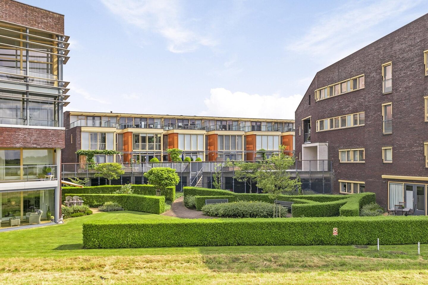 De onderhoudsvriendelijke tuin biedt een heerlijke open ruimte gelegen aan een pad waar via een trap toegang is tot de lager gelegen groen en pad langs rivier de Noord. De tuin wordt gescheiden van dit pad middels een border vol groen. De tuin wordt omringd door een ijzeren pergola waar een klimplant haar weg omheen vindt