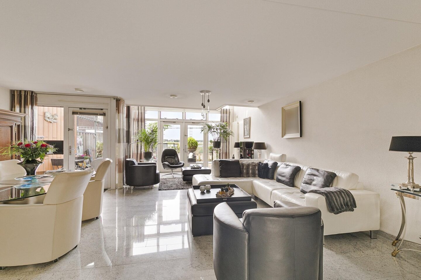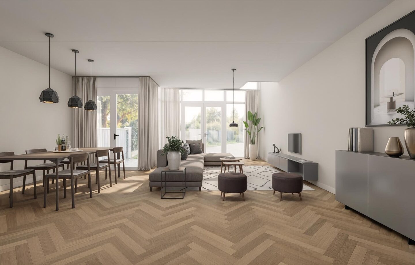 De woonkamer biedt een ruime en lichte leefruimte dankzij de vide op de eerste verdieping en de raampartij die zich uitstrekt over de volledige hoogte van de begane grond en eerste verdieping. De speelse indeling biedt ruimte voor meerdere eet- en zithoeken. Via dubbele openslaande deuren is er directe toegang tot de tuin.