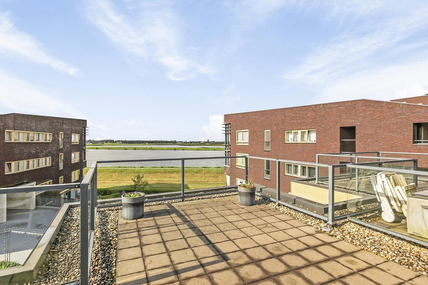 Een ruim dakterras, gelegen op het zuidwesten, biedt de hele dag zon. Het terras is gedeeltelijk overdekt met lamellen en is volledig betegeld, omringd door een border van siergrond. Vanaf het dakterras is er waanzinnig uitzicht richting rivier de Noord.