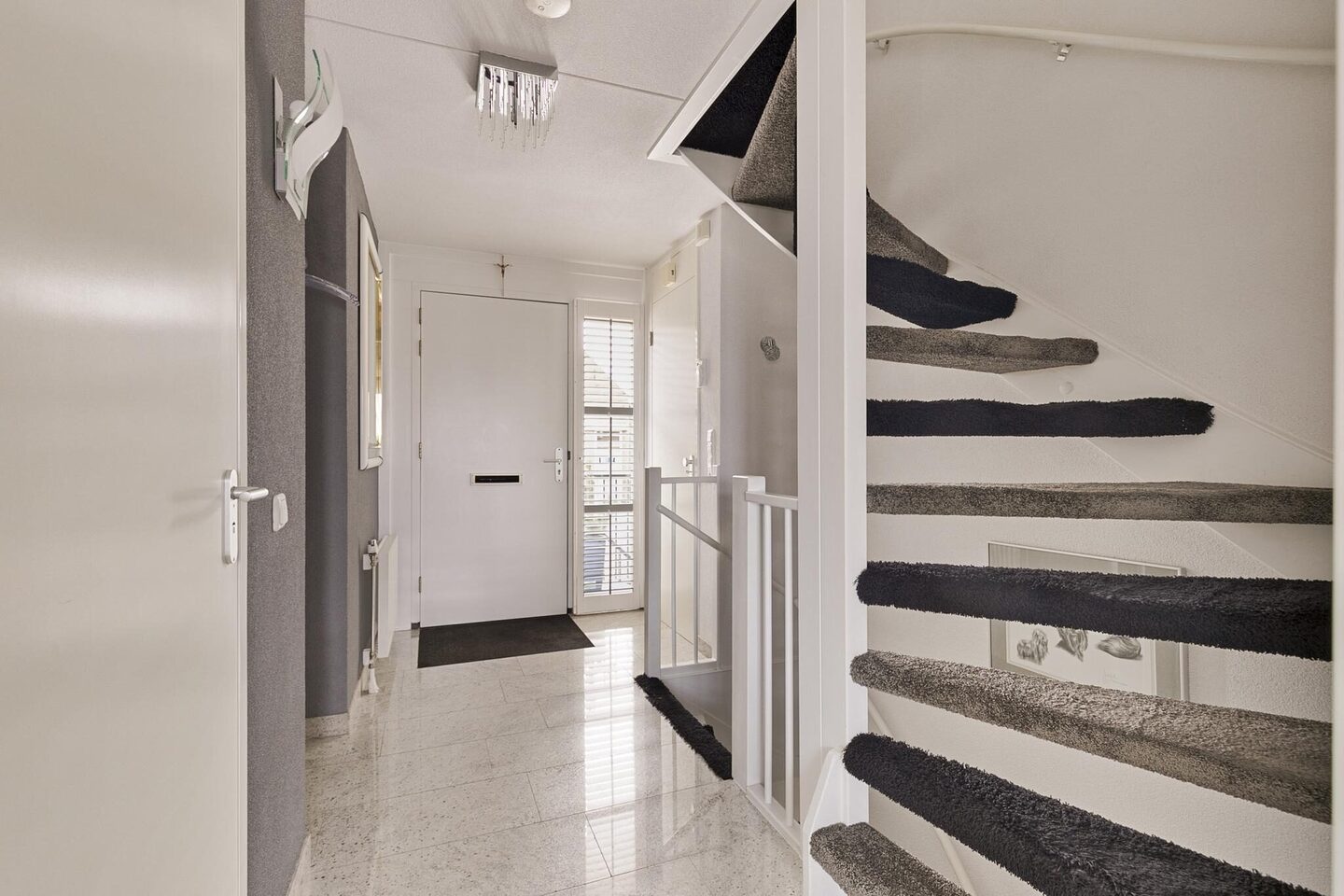 Bij binnenkomst in de ruime hal valt de strakke afwerking op met een grijskleurige granietvloer, spachtelputz wanden en een spuitwerk plafond, deze afwerking loopt over de gehele begane grond. De hal biedt toegang tot de woonkamer, de toiletruimte, de trapopgang naar de eerste verdieping en de ondergelegen parkeergarage in het souterrain. De meterkast bevindt zich in de hal en is uitgerust met 8 groepen en een aardlekschakelaar. De volledige begane grond is voorzien van vloerverwarming als bijverwarming.