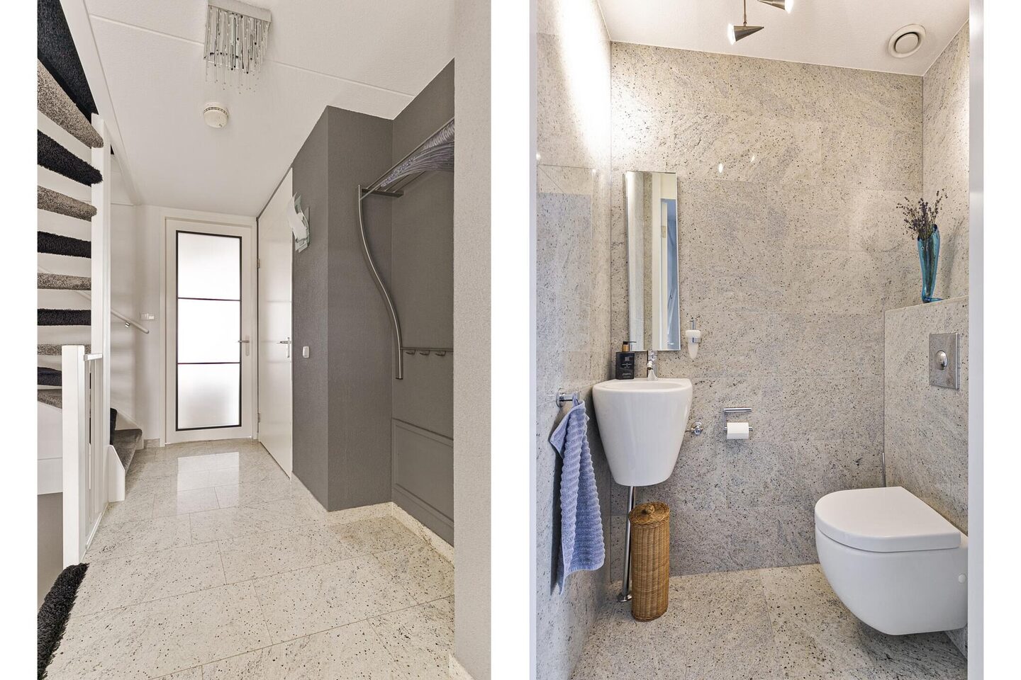 In de toiletruimte loopt het grijskleurige graniet door over de wanden. De toiletruimte is voorzien van een wandcloset en een fonteintje.