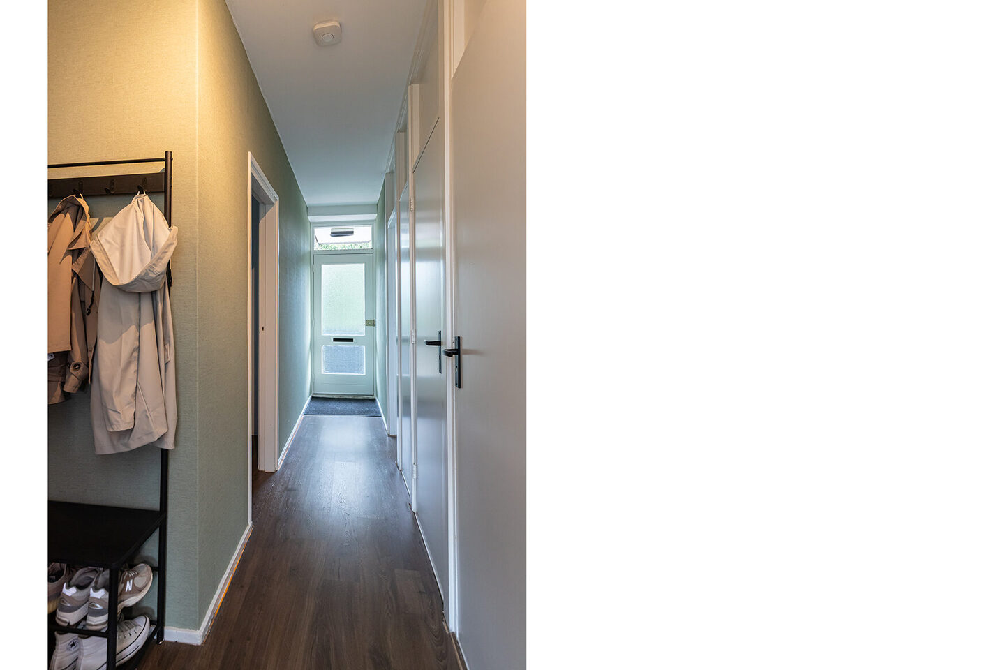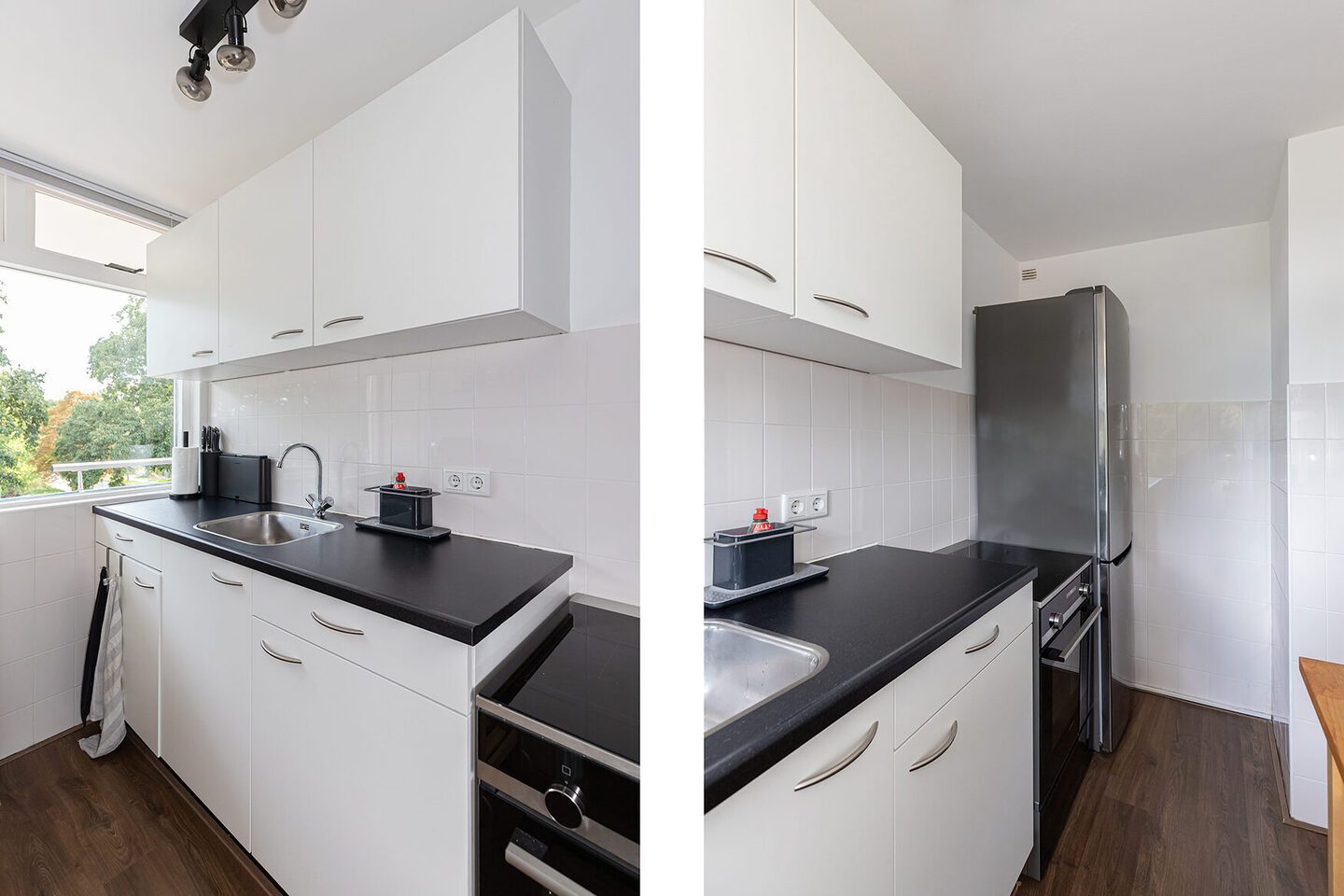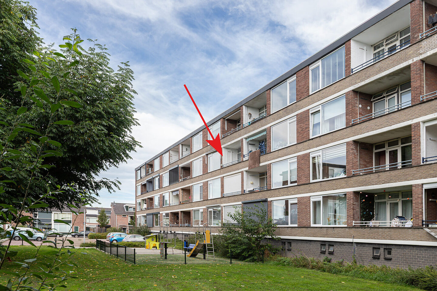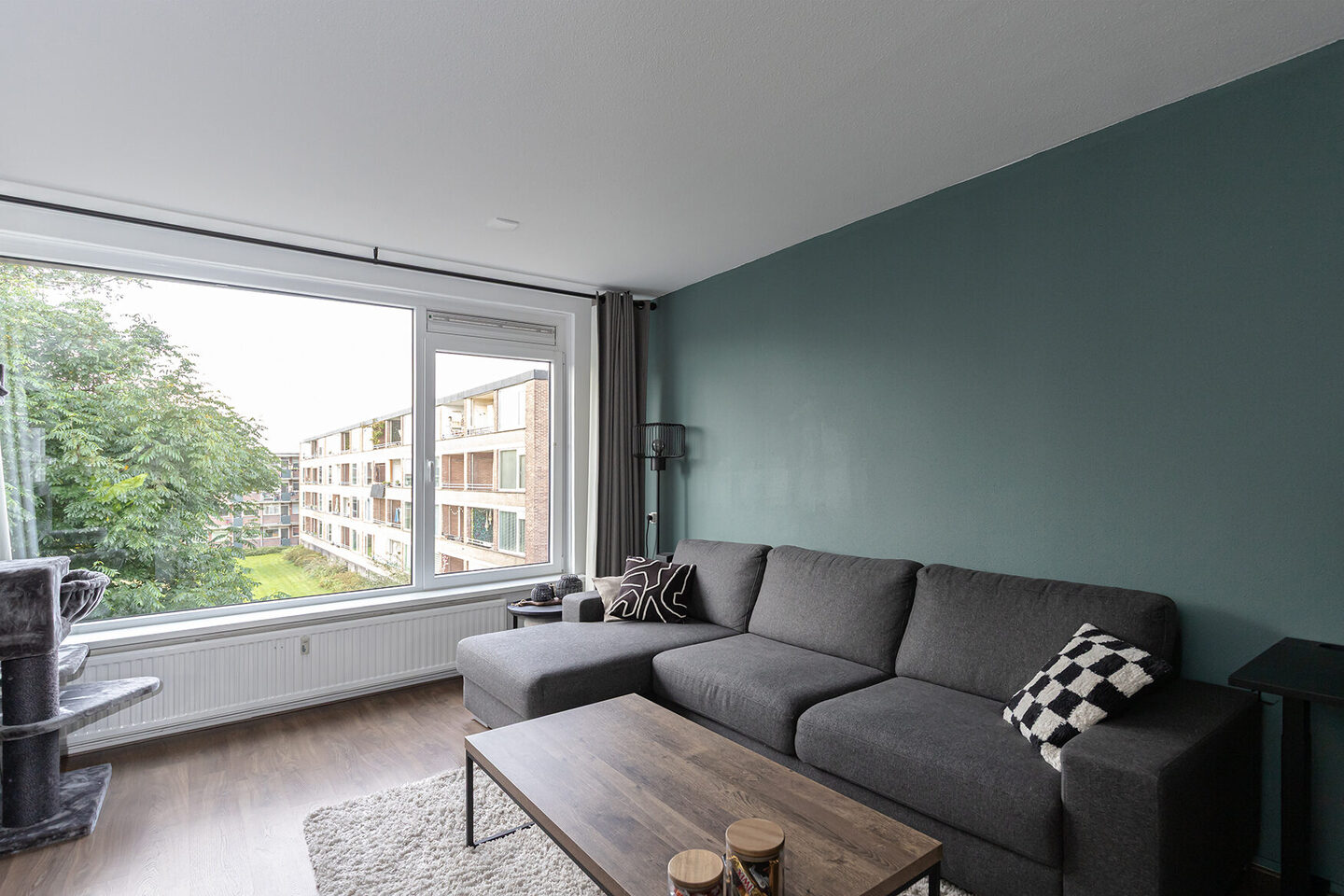 De laminaatvloer met een rustieke uitstraling loopt bijna door het hele appartement en geeft een warme sfeer. Vanuit de hoofdslaapkamer stap je het zonnige balkon op het zuiden op, waar je uitkijkt over een groen grasveld en volop kunt genieten van de buitenruimte.