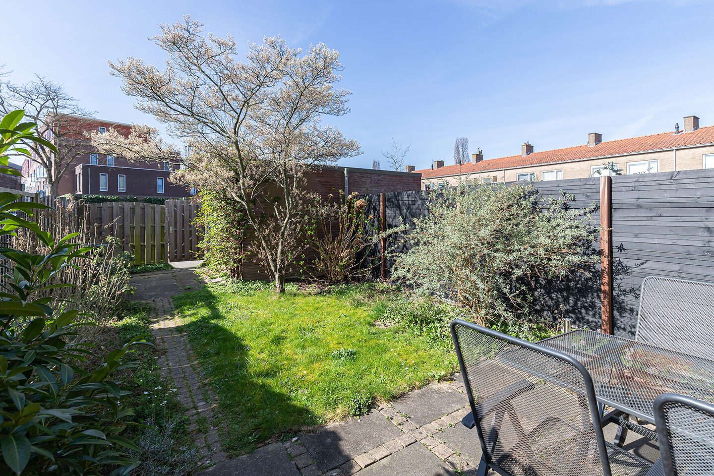 De achtertuin is gunstig gelegen op het zuidwesten, perfect om in de middag en avond van de zon te genieten. De tuin is aangelegd met een terras, een gazon en volwassen beplanting. Achterin de tuin bevindt zich een stenen berging met elektra en via de achterom is de tuin gemakkelijk bereikbaar.