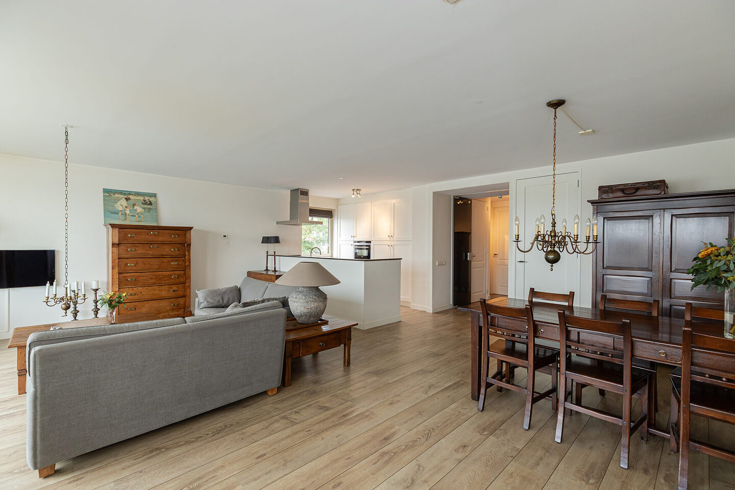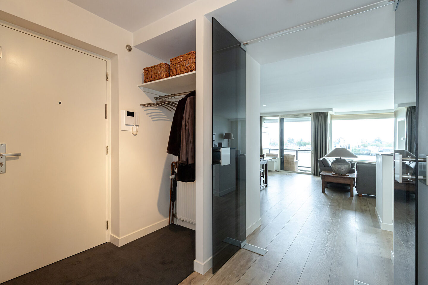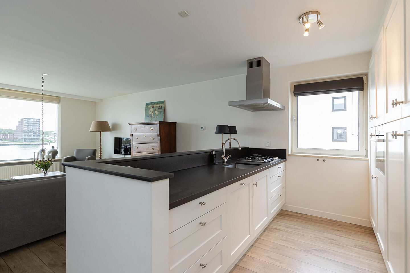 Binnen valt meteen het royale woonoppervlak op, met een riante woonkamer waar grote ramen zorgen voor veel lichtinval en een panoramisch uitzicht. Via de schuifpui stap je het zonnige balkon op het zuiden op, waar het heerlijk vertoeven is. De moderne keuken, vernieuwd in 2016, is uitgevoerd in een frisse, tijdloze stijl met witte kasten en een composieten werkblad. Dankzij het kookeiland en de praktische apparatenwand is er volop ruimte en comfort.