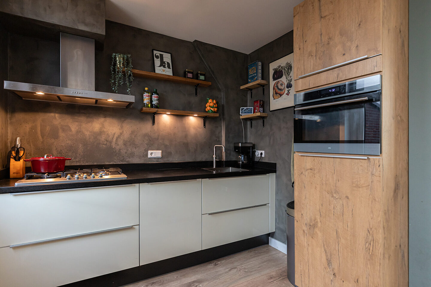 De open keuken, vernieuwd in 2017, vormt een stijlvolle en functionele werkruimte. Witte fronten worden gecombineerd met een antracietkleurig granieten werkblad en een betonlook wandafwerking. De keuken is compleet uitgerust met een 5-pits gaskookplaat, combimagnetron, vaatwasser, koelkast, afzuigkap, Quooker en close-in boiler. Vanuit de keuken leidt de achterdeur naar de royale overkapping, die dankzij glazen schuifpanelen volledig kan worden afgesloten. Dit maakt het een heerlijke plek om het hele jaar door te genieten van het buitenleven. Aangrenzend ligt de stenen berging, momenteel ingericht als praktische bijkeuken met aansluitingen voor de wasapparatuur.