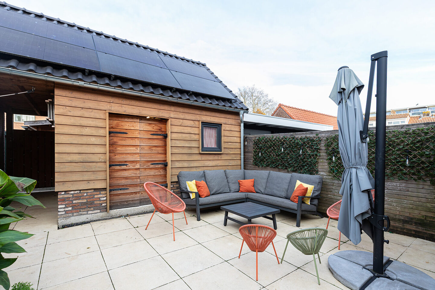 Achter in de tuin staat een royale houten berging met vliering, momenteel in gebruik als werkplaats en ideaal voor hobby’s of klussen. Op het dak van deze berging liggen de zes zonnepanelen, optimaal gepositioneerd op het zuidwesten.