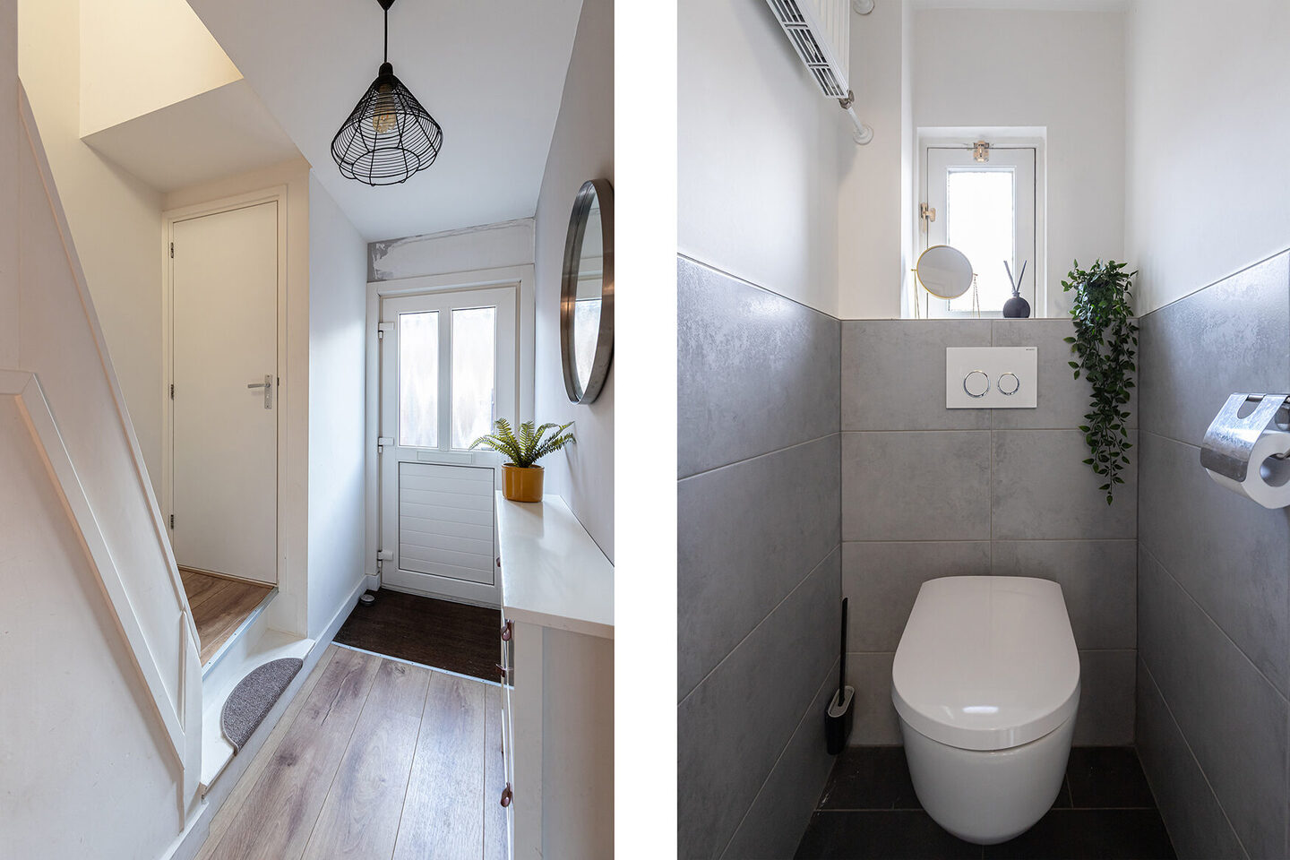 Bij binnenkomst in de hal valt direct het verzorgde afwerkingsniveau op. De moderne toiletruimte is uitgevoerd met grijze betegeling en strak stucwerk en een wandtoilet. Vanuit de hal zijn de trapopgang naar de verdieping en de trapkast bereikbaar. De doorzonwoonkamer voelt licht en uitnodigend dankzij de grote ramen aan beide zijden. De laminaatvloer met rustieke uitstraling loopt door in vrijwel het gehele huis en geeft een warme, eigentijdse sfeer.