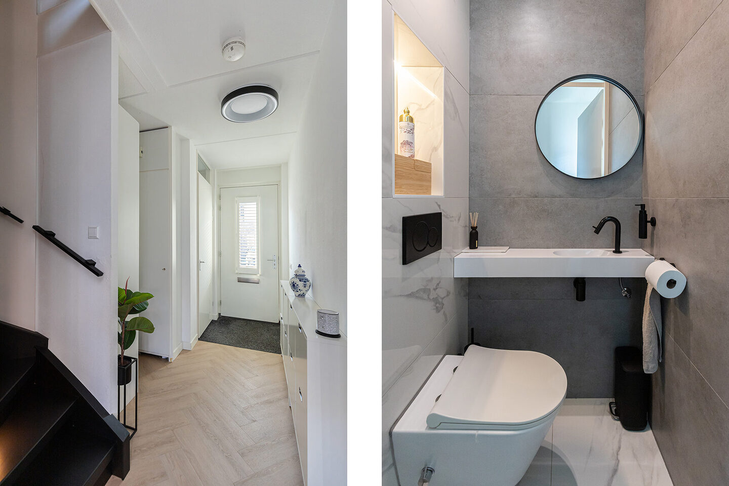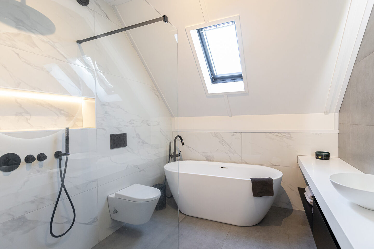 Op de eerste verdieping bevinden zich drie ruime slaapkamers, stuk voor stuk netjes afgewerkt en licht van karakter. De badkamer is eveneens vernieuwd en uitgevoerd in een moderne stijl met lichte tinten en stoere zwarte details. Hier vind je een vrijstaand ligbad, een aparte douche met hand- en regendouche, een dubbele wastafel met meubel, een spiegel met verlichting en een wandtoilet – alles tot in de puntjes verzorgd.