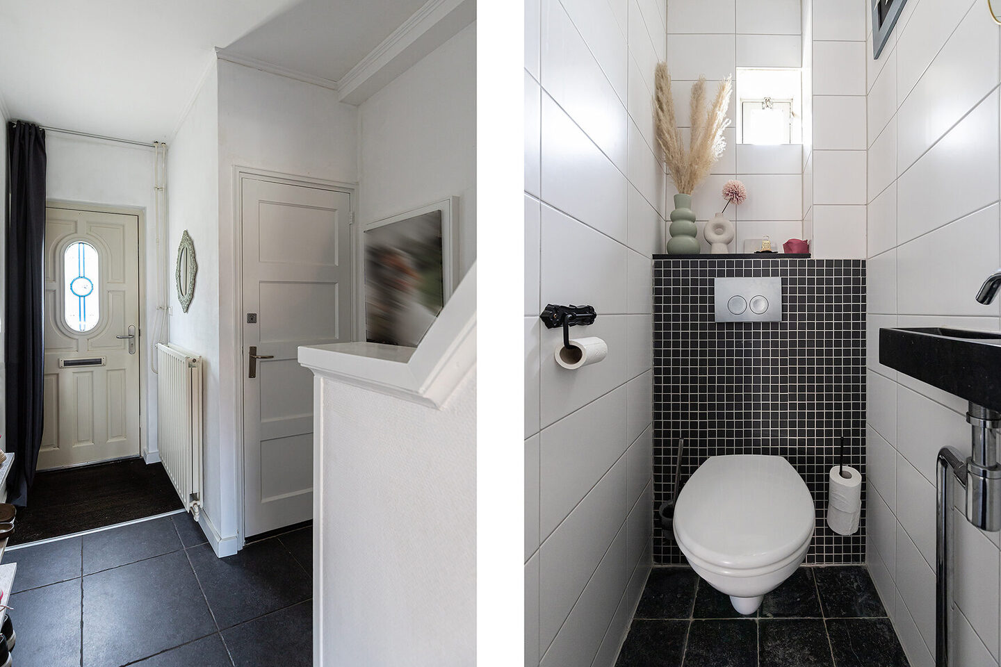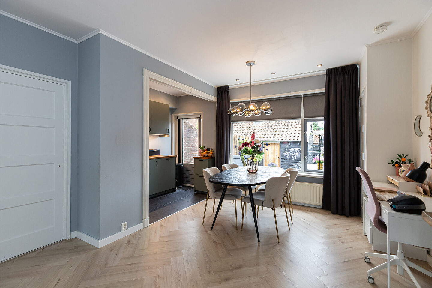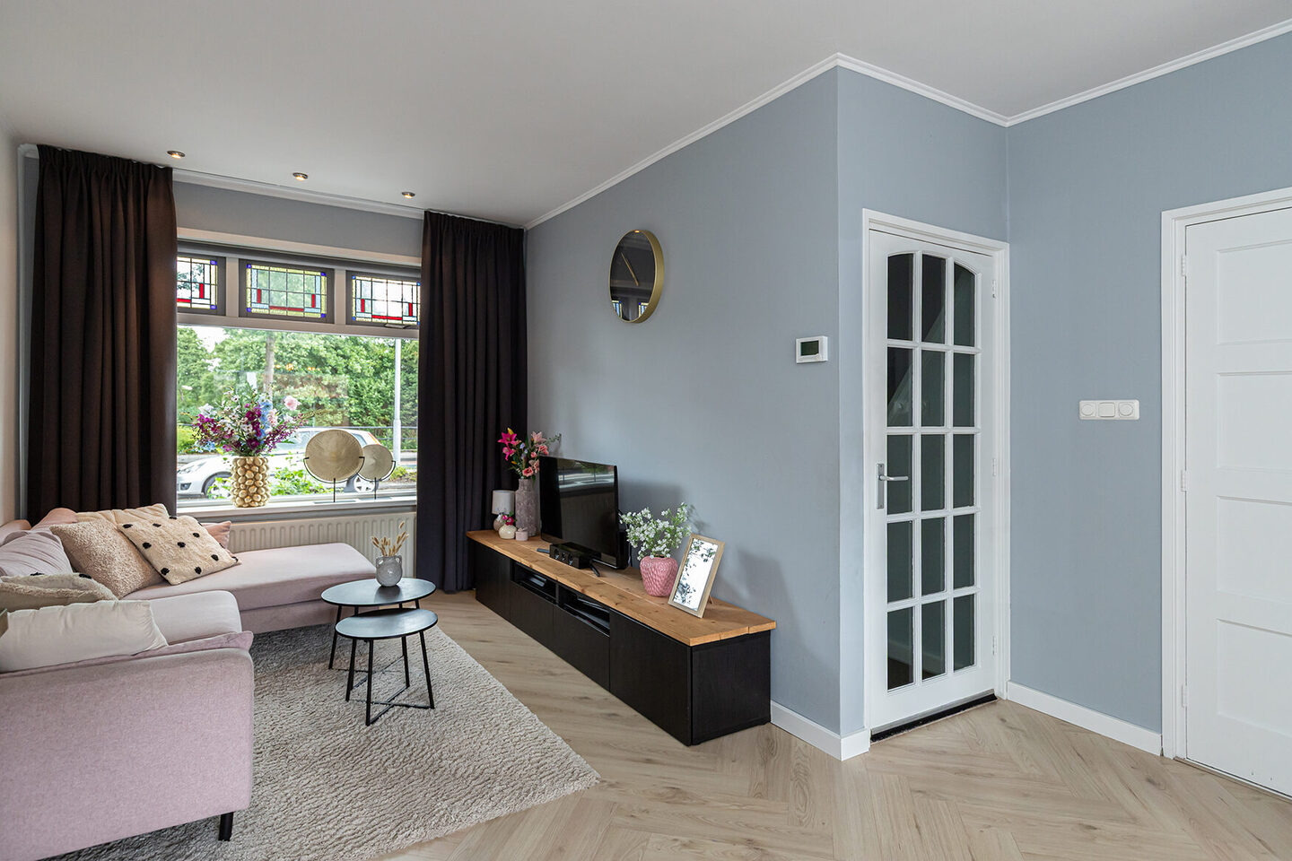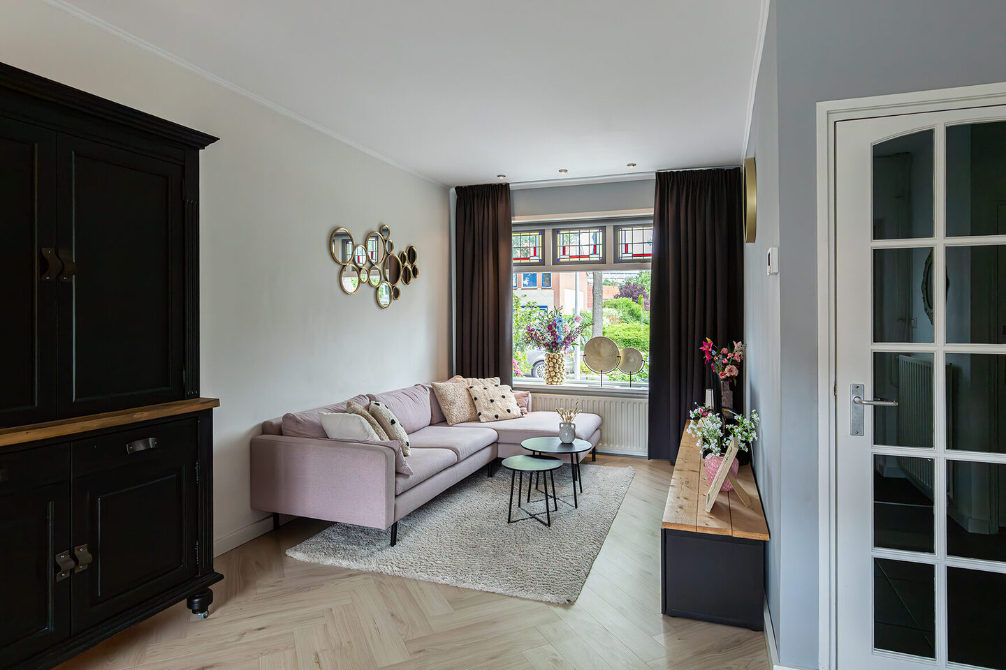 Bij binnenkomst valt direct de prettige sfeer op. De hal biedt toegang tot een modern toilet met fonteintje en leidt je naar de royale woonkamer, waar het glas-in-lood prachtig licht vangt. Aan de achterzijde geniet je van een vrij uitzicht op de tuin en is de keuken bereikbaar via een toog. In de woonkamer ligt een fraaie visgraatvloer; de hal en keuken zijn afgewerkt met grote antracietkleurige plavuizen, wat zorgt voor een stoere en eigentijdse uitstraling.