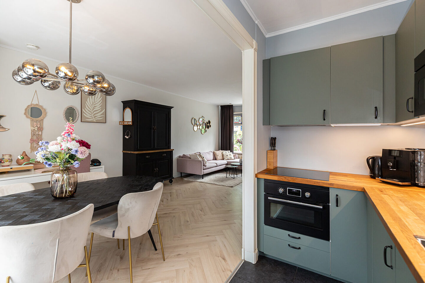 De keuken – vernieuwd in 2020 – is uitgevoerd in een stijlvolle olijfgroene kleur met een eikenhoutkleurig werkblad. Deze hoekopstelling is uitgerust met alle benodigde inbouwapparatuur, waaronder een elektrische kookplaat, oven, magnetron, koelkast, vaatwasser en afzuigkap. Vanuit de keuken stap je direct de tuin in, waar je tot in de late uurtjes van de zon kunt genieten.