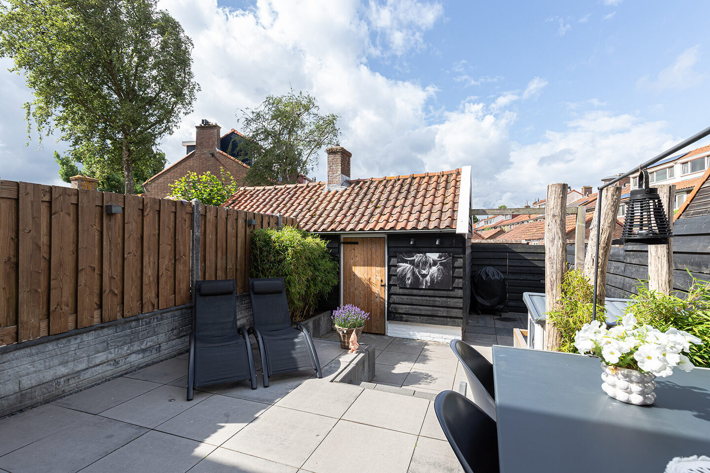 De achtertuin is een heerlijke plek om tot rust te komen. Gelegen op het zuidwesten, voorzien van een groot terras en een speels niveauverschil, is dit een fijne buitenruimte met volop privacy. Achter in de tuin staat een ruime houten berging (3,30 x 3,00 m) met elektra. Via een achterom is de tuin ook gemakkelijk bereikbaar.