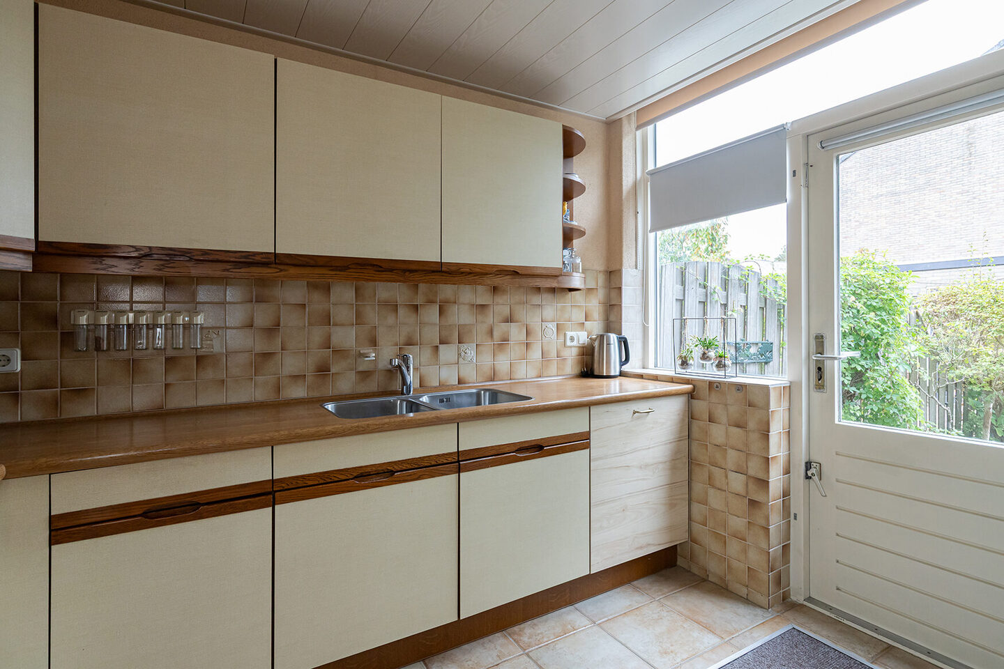 Binnen zorgt de doorzonwoonkamer voor een lichte en aangename sfeer, met aan de voorzijde zicht op het groen en aan de achterzijde op de tuin. De open verbinding naar de keuken maakt het geheel ruimtelijk. De keuken zelf is eenvoudig uitgevoerd, maar functioneel en netjes onderhouden. De plavuizen vloer met vloerverwarming (bijverwarming) zorgt voor extra comfort.