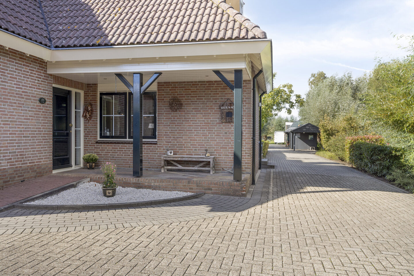 Er is een vrijstaande stenen dubbele garage, gebouwd in dezelfde stijl als de woning, met elektrische deuren, een loopdeur, elektra, wateraansluiting en een vlizotrap naar de zolder. Daarnaast is er een houten berging met extra stalling/ruimte, ideaal voor het stallen van een camper, boot of caravan. Deze berging heeft openslaande deuren en een sfeervolle overkapping.
