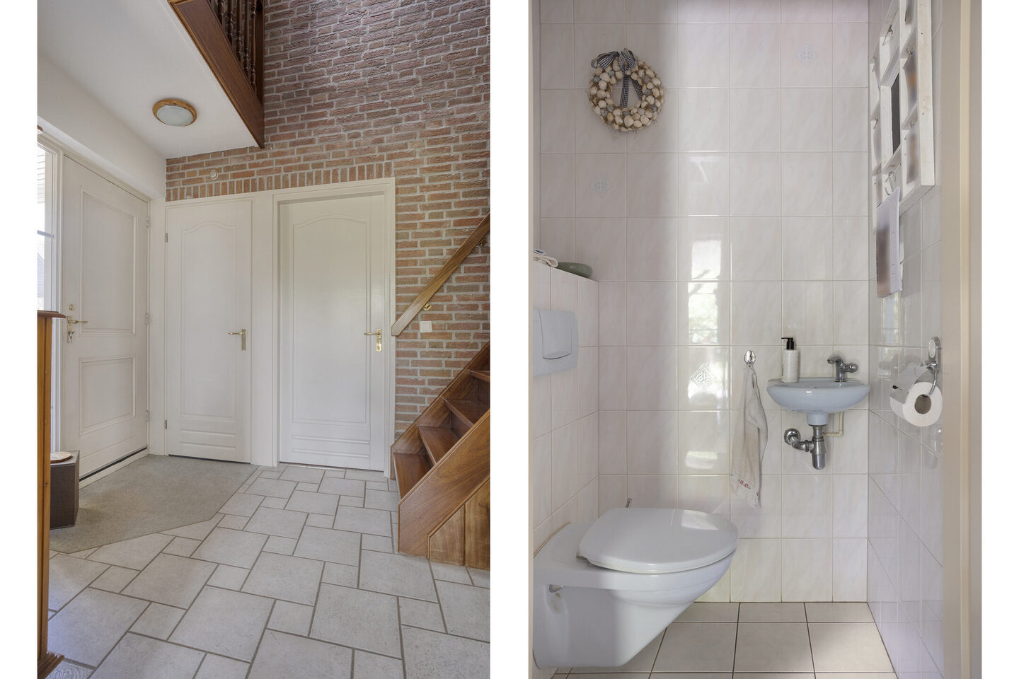 Vanuit de keuken bereik je het achterportaal, met toegang tot de tuin en de bijkeuken/wasruimte met tweede toilet. De keuken, bijkeuken en toiletruimte zijn voorzien van vloerverwarming. Op de rest van de begane grond liggen houten vloerdelen.