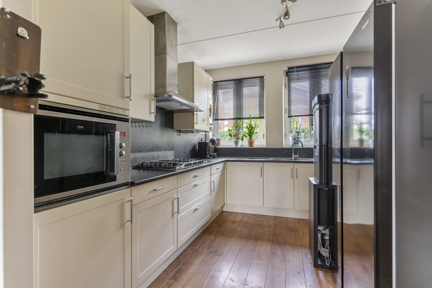 Aan de voorzijde ligt de open keuken in L-opstelling, uitgevoerd in beige met een zwart kunststof werkblad en voorzien van inbouwapparatuur zoals een vijfpits gaskookplaat, combimagnetron, vaatwasser en afzuigkap.