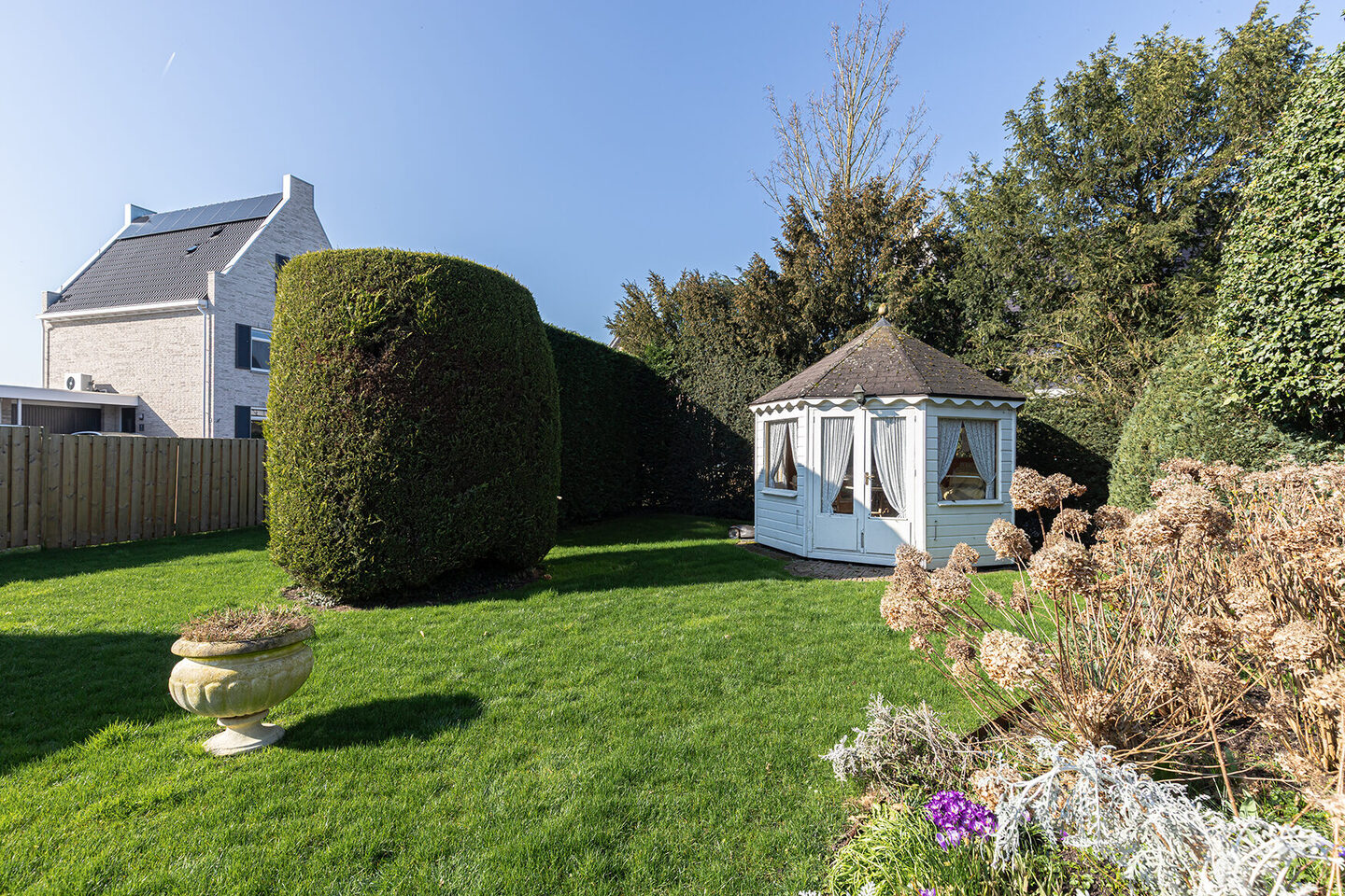 De tuin rondom de woning is met zorg aangelegd en vormt een groene oase met een bijna parkachtige uitstraling. De achtertuin, gelegen op het zuiden, biedt volop zon en privacy. Hier vindt u een gazon, diverse beplanting, meerdere terrassen en een charmant houten tuinhuisje. Een heerlijke plek om te ontspannen en te genieten van het buitenleven.