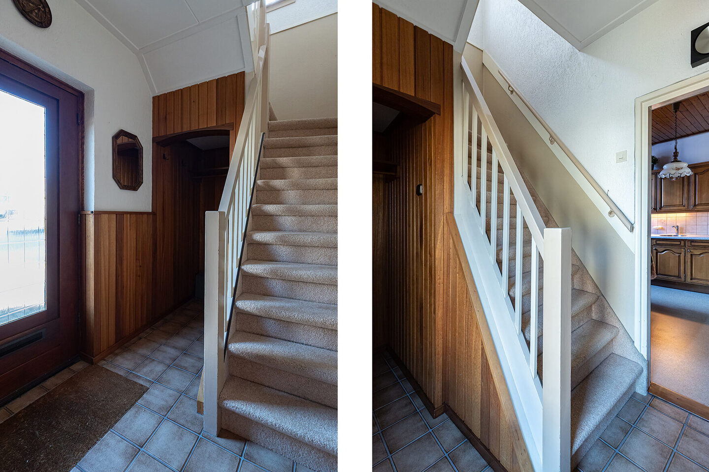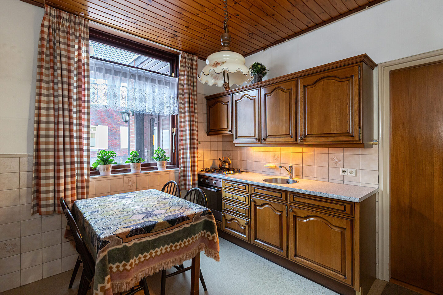 Bij binnenkomst via de hal, met garderobekast en trapopgang naar de verdieping, is de keuken bereikbaar. Deze is ingericht met een eiken keukenopstelling voorzien van een gaskookplaat, stoomoven, vaatwasser, koelkast en afzuigkap. De keuken is van oudere datum en biedt daarmee volop mogelijkheden om deze naar eigen smaak te moderniseren.